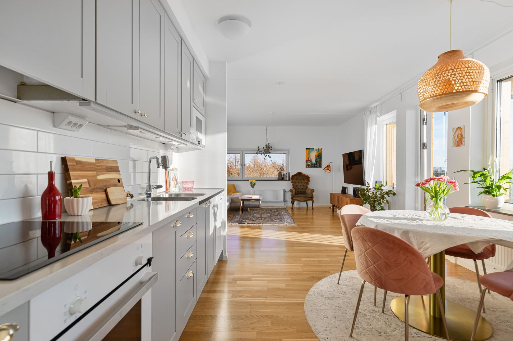 Den öppna planlösningen mellan kök och vardagsrum skapar en ljus och social samlingsplats. Köket håller hög standard med tidlösa grå luckor, kvalitativa vitvaror från Siemens samt en elegant helhetskänsla som passar både vardag och fest. De stora fönsterpartierna släpper in rikligt med ljus och förstärker känslan av rymd.