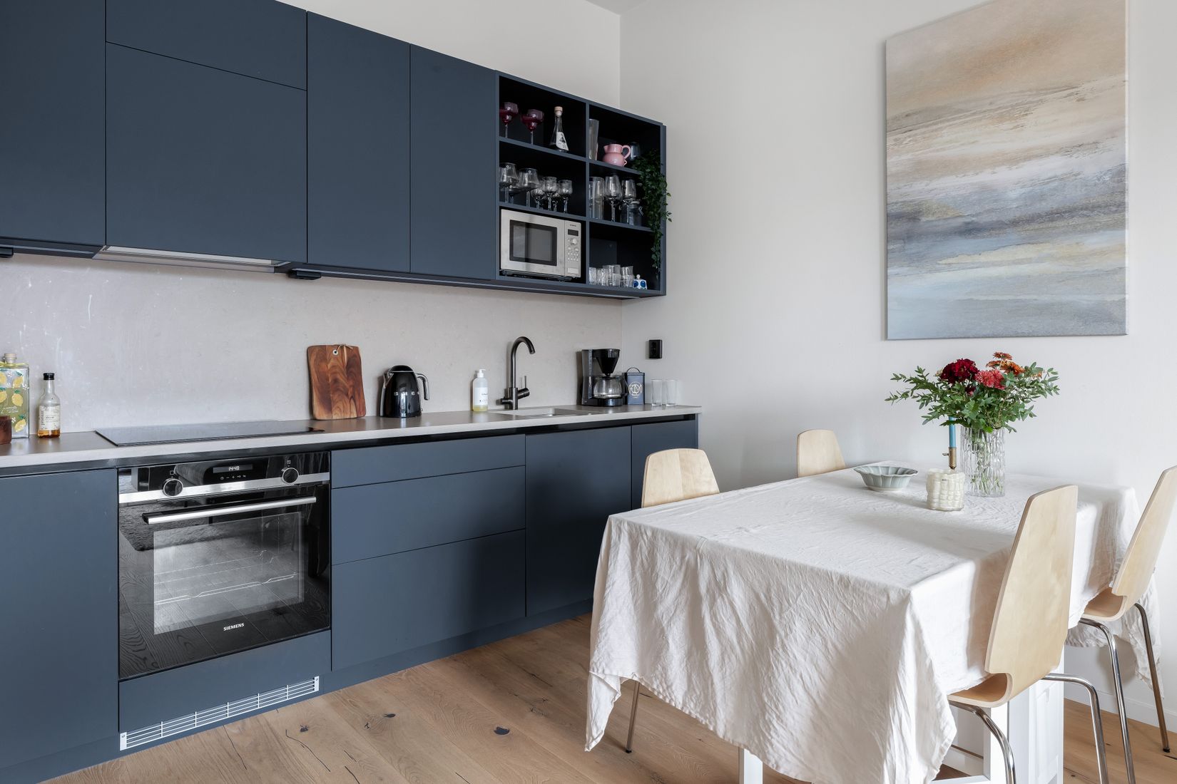 Köket går i en mörkgrå ton och är utrustat med bänkskiva och stänkskydd i kalkstensfärgad kvartskomposit samt vitvaror från Siemens – en inspirerande plats för dig som tycker om att laga mat.