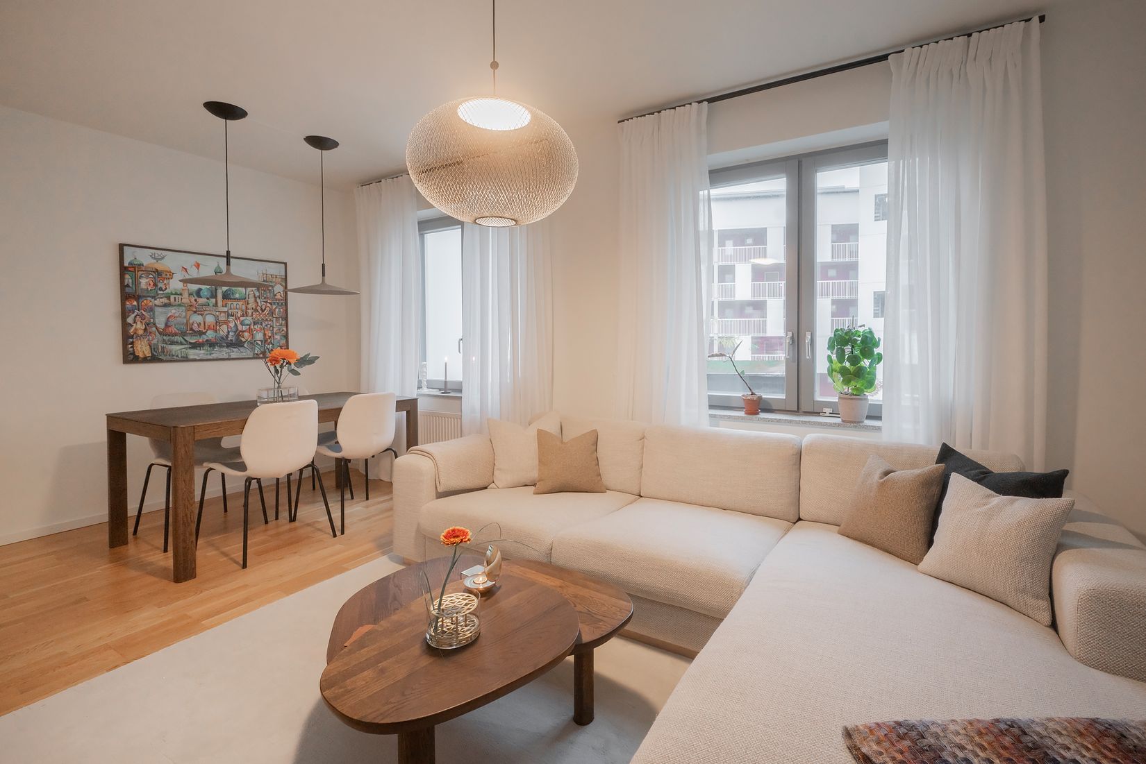Det moderna köket är fullt utrustat med allt du behöver och har en öppen planlösning mot vardagsrummet, vilket skapar en social och trivsam yta att umgås på. Här flödar ljuset in genom stora fönsterpartier som ger både rymd och utsikt över den lugna innergården. Sovrummet är rofyllt och hallen erbjuder gott om förvaring med flera inbyggda garderober.