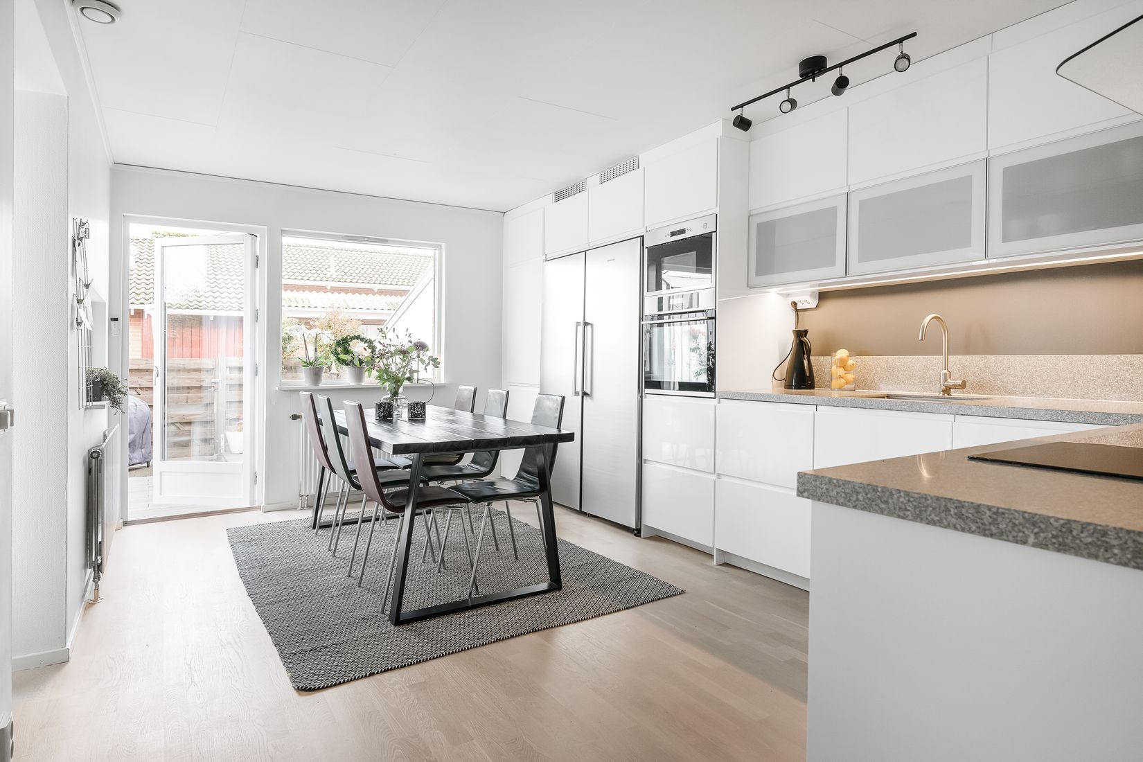 Utomhus njuter ni av en härlig hörntomt som är insynsskyddad, lättskött och med gott om utrymme för både lek och avkoppling. Det generösa trädäcket rymmer allt från grillkvällar till lugna stunder i solen.