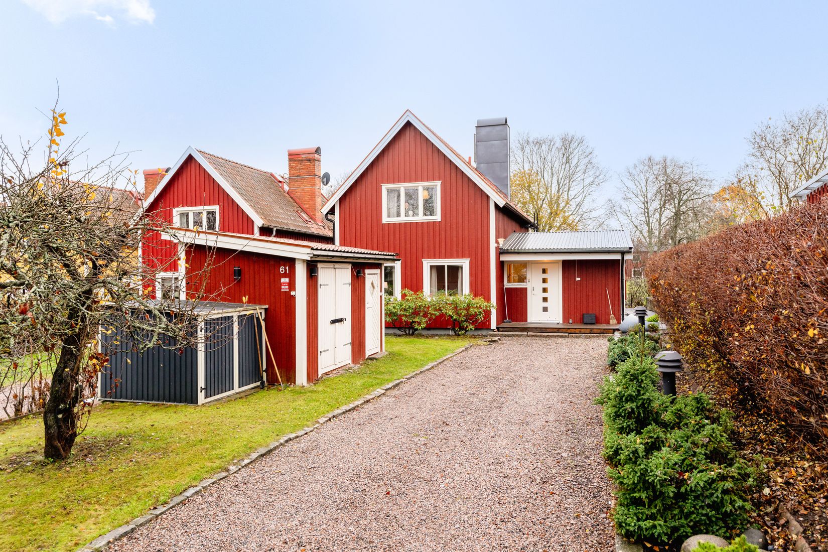 På framsidan finns trevlig farstukvist, grönskande buskar och ett äppelträd. Uppfart med plats för 3-4 stycken bilar. Friggebod med extra sängplatser och en cykelbod.