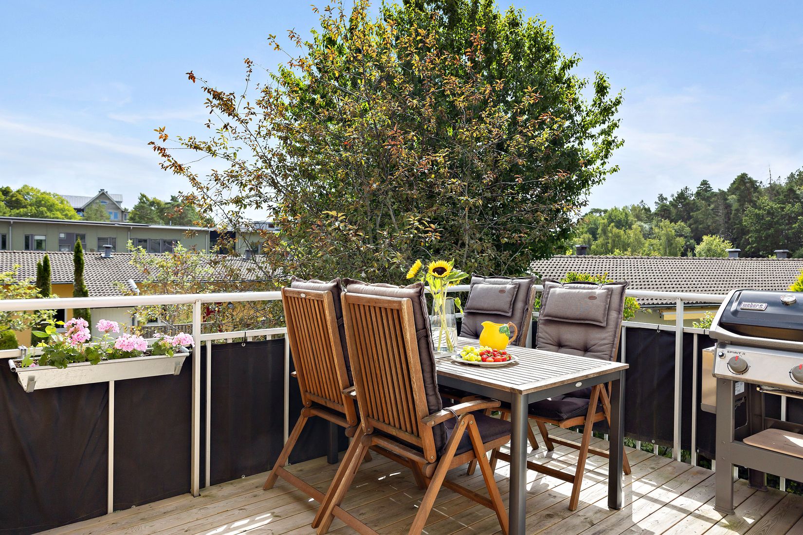 På den rymliga balkongen i soligt söderläge har ny trall lagts. Här kan du njuta av solen från tidig morgon till sen eftermiddag. Balkongen är insynsskyddad och erbjuder generöst med plats för både grill och matgrupp eller bekväma loungemöbler. Läget är föreningens bästa med fri utsikt över grönskan utan att kompromissa med privatlivet, en perfekt plats att njuta av sommarens alla stunder.
