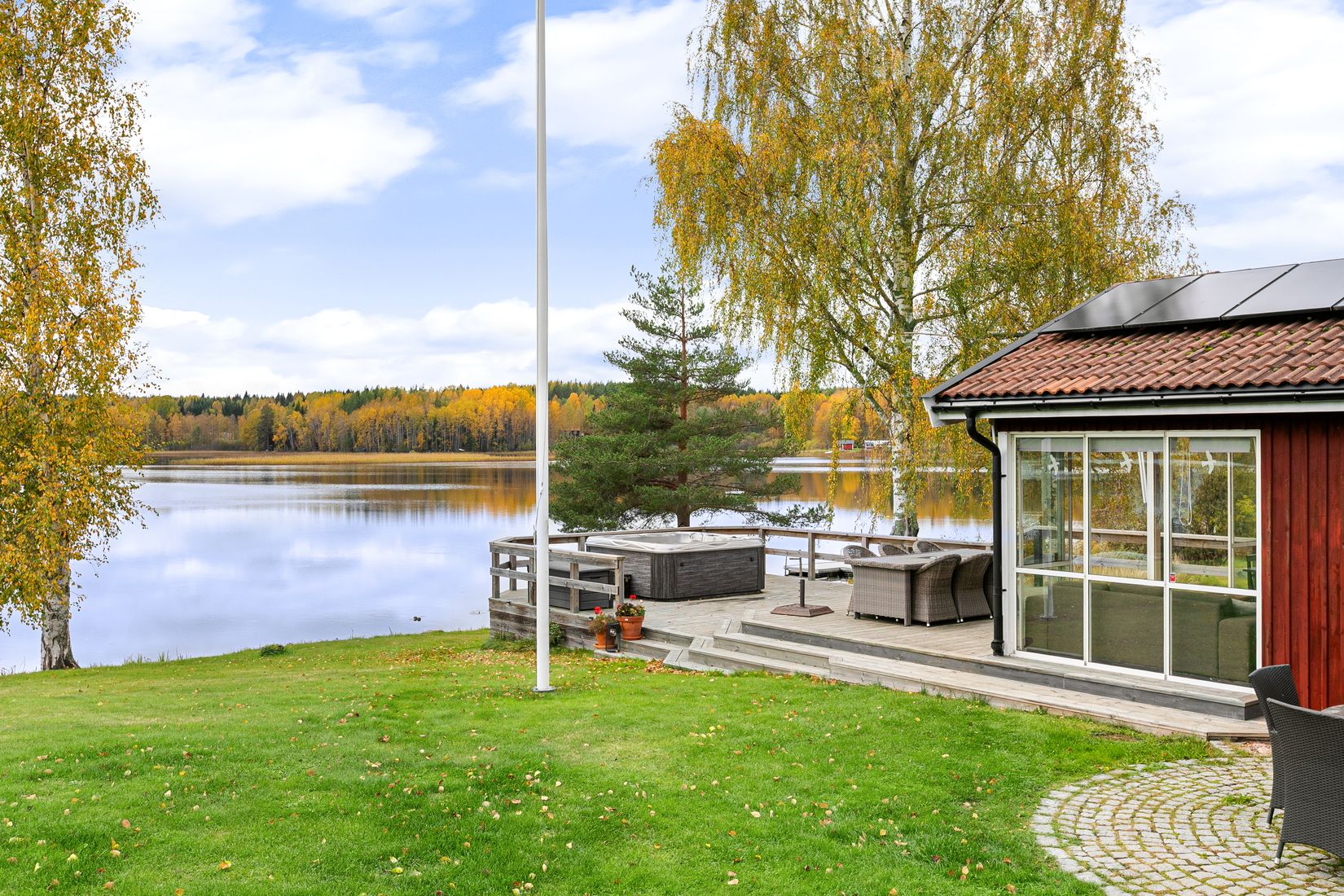 På altanen i söderläge finns gott om plats för både loungemöbler och middagsbord. Med Ycklaren som bakgrund, blir varje sommarkväll en upplevelse. I massagebadet kan du sjunka ner och låta blicken vila över vattnet när solen går ner bakom trädtopparna.