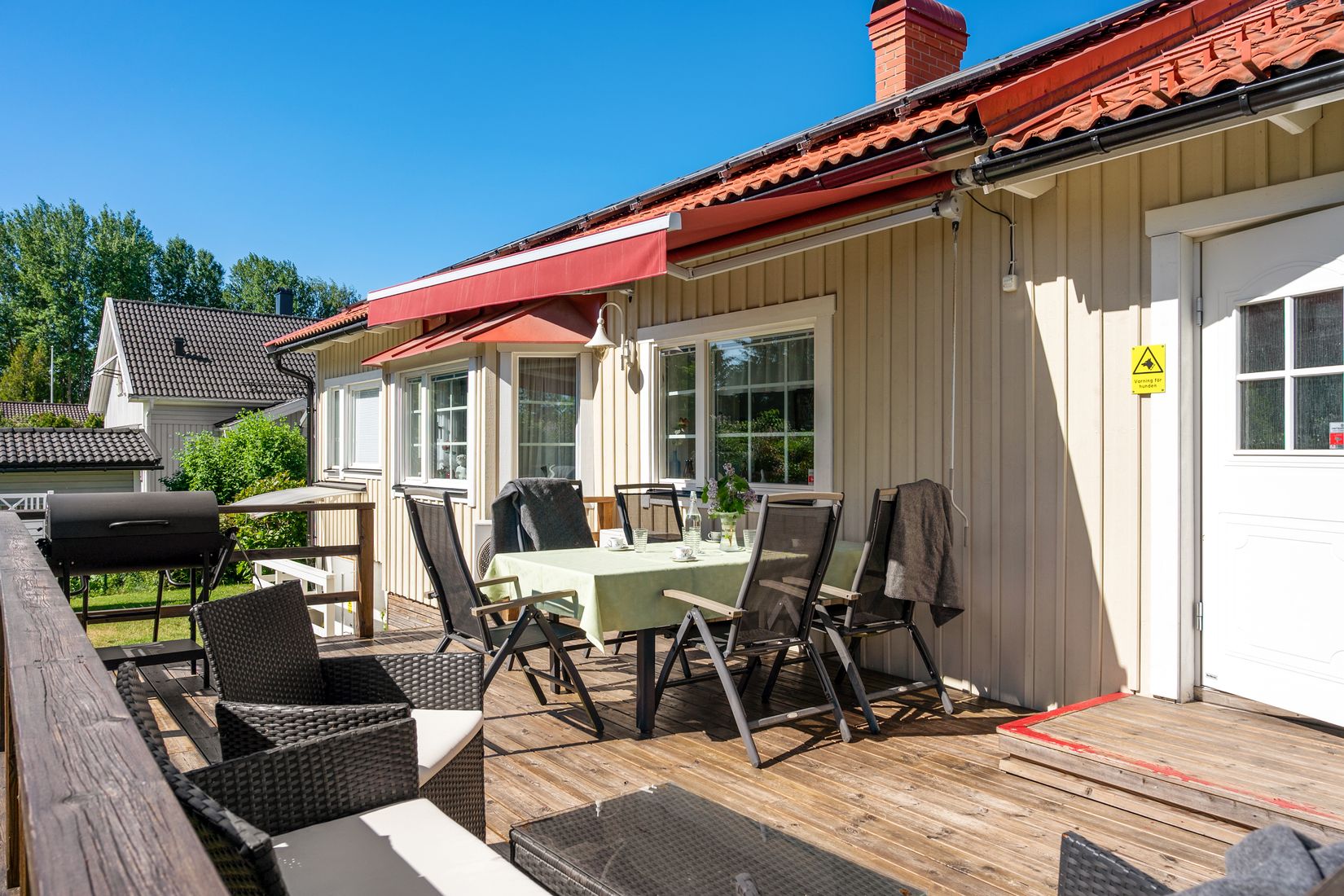 Den lättskötta trädgården har fina gräsytor, blommande växter och flera trevliga uteplatser där du kan njuta av solen under dagen. På uppfarten finns plats för två bilar. Med solceller installerade på taket får du dessutom ett energieffektivt och miljövänligt boende med låga driftskostnader.