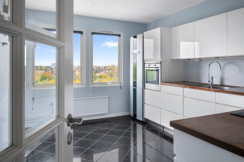 Här uppe på åttonde våningen välkomnas vi av denna ljusa, genomgående och välplanerade bostad. Här kan man verkligen stoltsera med milsvid utsikt över slätt och sund.