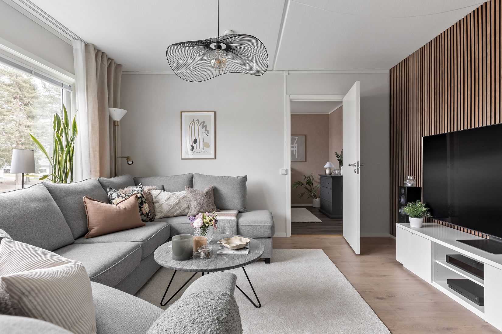Här finns ett stilrent renoverat kök med vita släta luckor, vitt stänkskydd och mörkgrå bänkskivor samt full maskinell utrustning. Vid fönster har du utrymme för matgrupp. I kök och hall ligger ett lättskött klickgolv med klinkerliknande utförande och från hallen nås balkongen. Badrummet renoverades 2015 i ett sobert och tidlöst utförande med ljusgrått klinkergolv och vitt kakel på väggar, här finns också tvättmaskin för en bekväm vardag. Lättmöblerat vardagsrum med ett rikligt ljusinsläpp via stora fönster. Här ligger ett fint laminatgolv och akustikpanel längs ena väggen är ett fint inslag i rummet. Två fina sovrum i bra storlek varav det ena har access till walk on closet, vinylgolv i bägge sovrummen. Strax utanför ytterdörren återfinns ett tillhörande förråd, vilket ger bra möjlighet till extra förvaring.