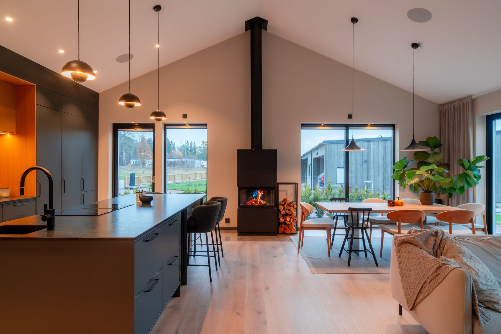 Villan, uppförd 2023, bjuder på öppna och ljusa sällskapsytor med generös takhöjd, golv-till-tak-fönster och en centralt placerad braskamin som skapar en varm atmosfär. Det eleganta köket från Vedum smälter samman med vardagsrummet och utgången till den stora altanen i sydvästläge - delvis under en vacker pergola med sol långt in på kvällen.