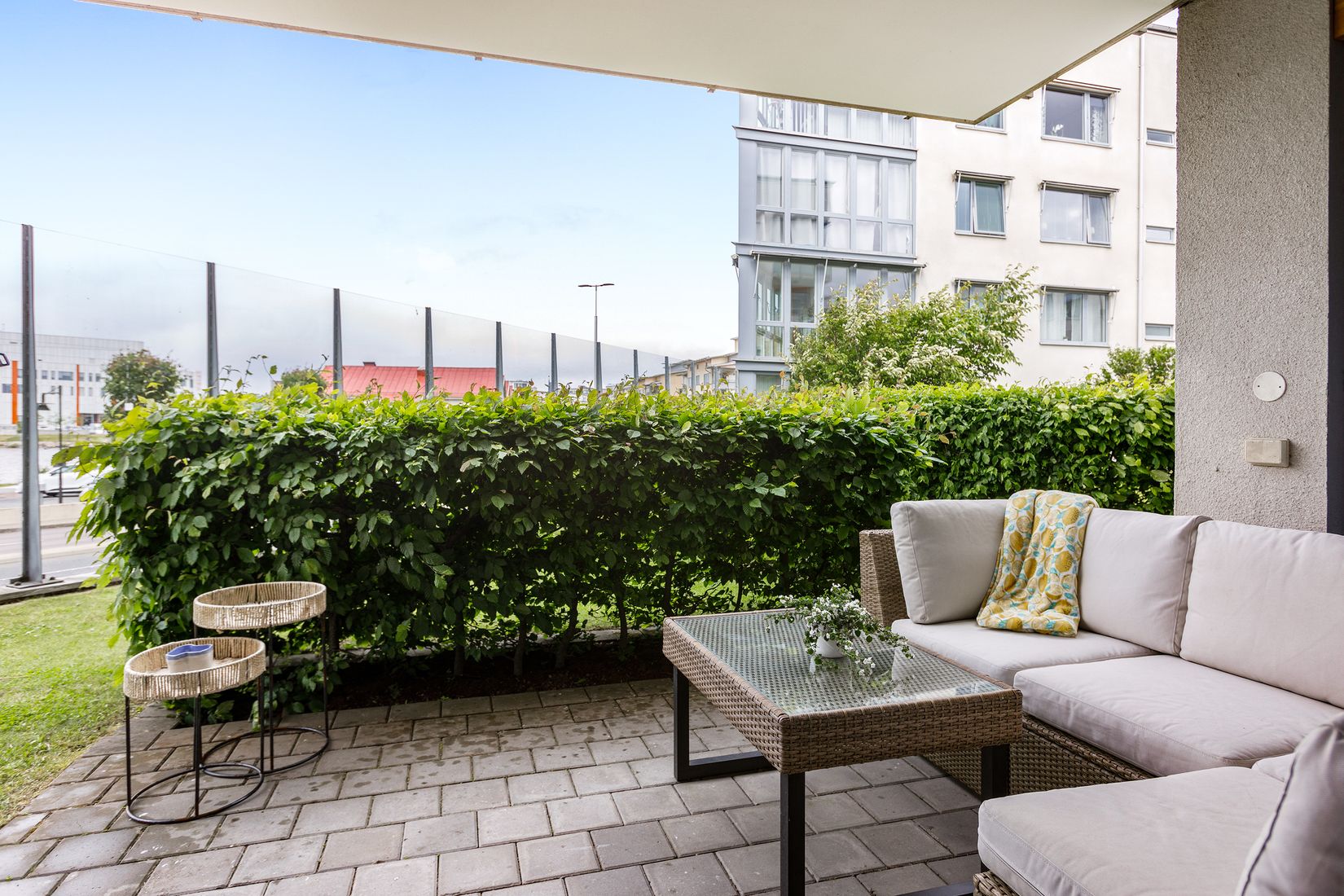 Denna moderna och välplanerade tvårummare erbjuder ett bekymmersfritt boende, som är utrustad med alla tänkbara bekvämligheter som krävs för ett avstressat liv. Esset är helt klart den underbara uteplatsen som också smälter samman med föreningens vackra trädgård, vilket gör att du kan njuta till fullo av alla de ''extra-ytor'' som erbjuds och som också skapar mervärden i din vardag. Dessutom vetter hela bostaden i en upphöjd nivå som minimerar insynen, och den ljudisolerade glasväggen som går i samma höjd som lägenheten håller oljuden borta på ett ypperligt sätt.