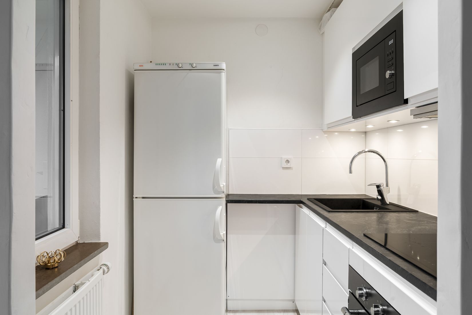 Bostaden har en modern och stilren känsla där varje kvadratmeter används optimalt. Köket är smakfullt renoverat med vit inredning, mörk bänkskiva, bra arbetsytor och full utrustning inklusive diskmöjligheter, spishäll, ugn, fläkt och kombinerad kyl/frys.