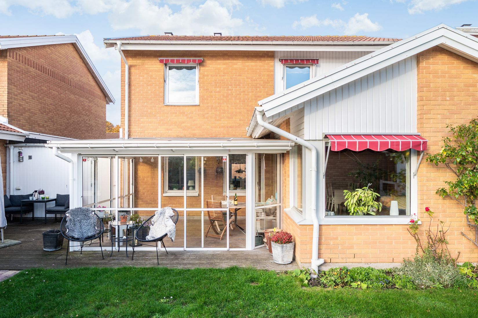 Utanför väntar en ljuvlig trädgård i soligt söderläge, med stort trädäck och ett inglasat uterum där du kan njuta av sommarkvällarna långt in på hösten. Här finns också garage, plats för ytterligare en bil samt en friggebod som lika gärna kan vara hemmakontor som gästrum.