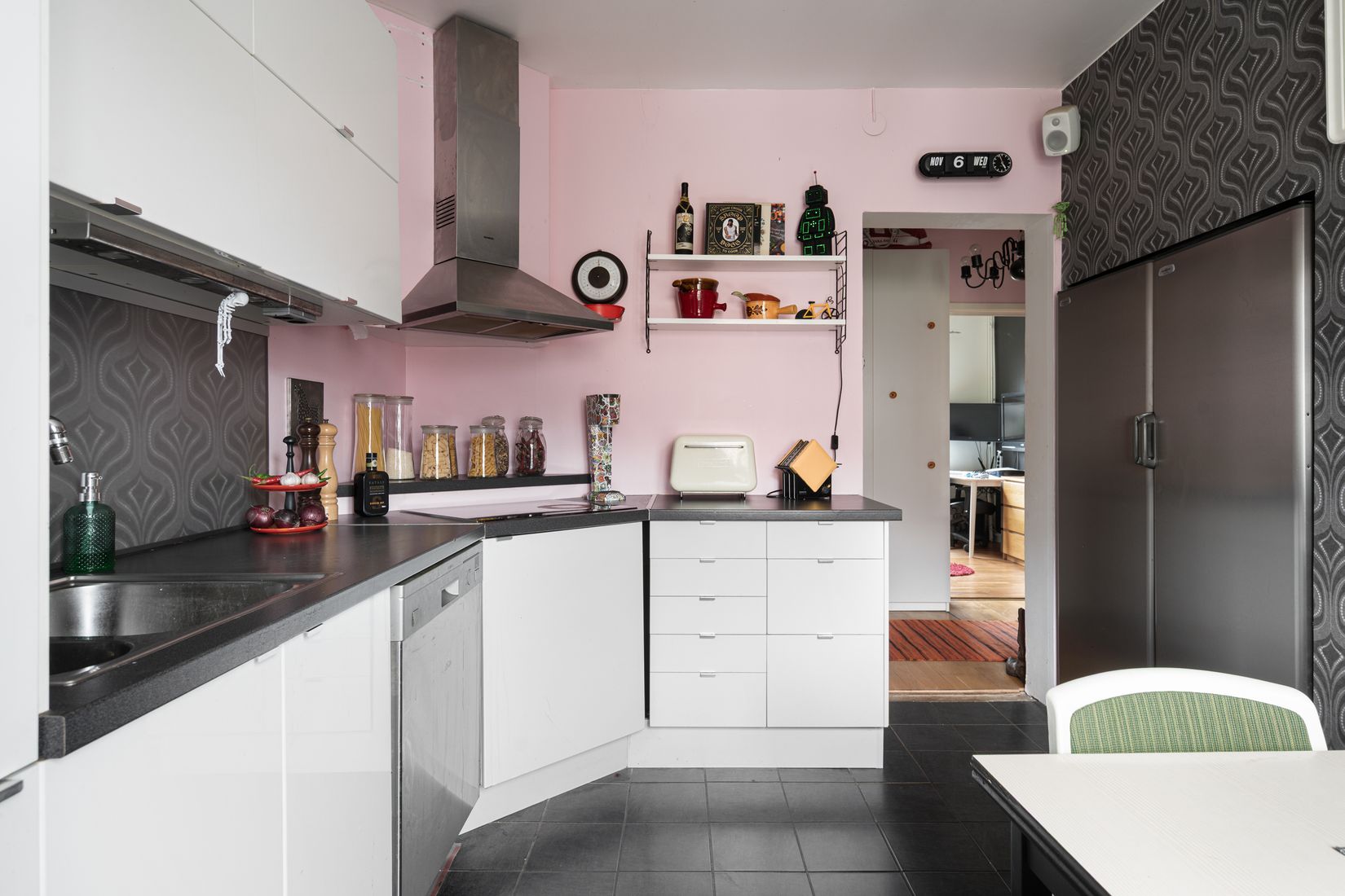 Köket är både funktionellt och hemtrevligt, med goda arbetsytor och plats för matgrupp. Lägenheten rymmer två rymliga sovrum med generösa förvaringsmöjligheter samt ett renoverat badrum med bra förvaring och handdukstork.