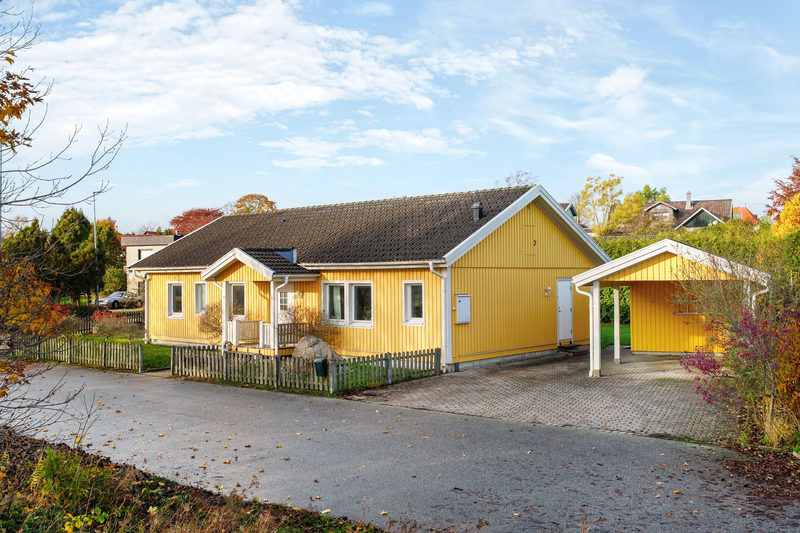 Utomhus fortsätter trivseln. Huset ligger på en hörntomt med gräsmatta runt nästan hela huset och en stor altan med trädäck som bjuder in till avkoppling under sommarkvällar. Här finns även ett praktiskt utvändigt förråd på cirka elva kvadratmeter samt en carport med plats för bilar. Den egna stenlagda uppfarten ger ett välkomnande och ordnat intryck.