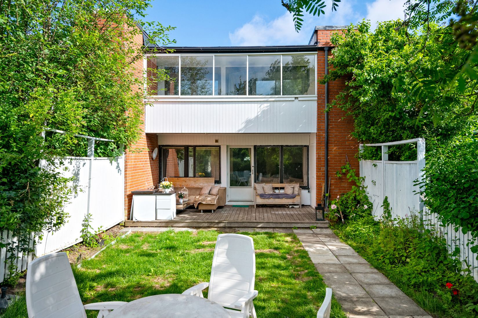 Trädgården på baksidan är en av bostadens absoluta höjdpunkter. Här möts du av ett generöst trädäck direkt utanför vardagsrummet – en perfekt plats för loungemöbler, grillkvällar och sommarens alla stunder. Den lummiga grönskan, gräsmattan och det vitmålade staketet ramar in en insynsskyddad oas som bjuder in till både avkoppling och lek.