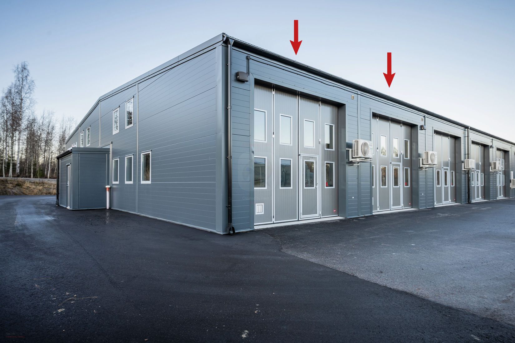 Gavellokalen har total 5 fönster, 3 st i markplan och 2 st på entresollplan. Lokalerna har en takhöjd om ca 4,5 meter i takhöjd vid porten, vilket ger god rymd och flexibilitet för olika typer av verksamheter. Båda lokalerna är försedda med extra fönsterrad i vikporten för bättre ljusinsläpp. Det är förberett för wc och dusch, vilket ger möjlighet att anpassa lokalen efter egna behov. Uppvärmning sker via luftvärmepump, och grundbelysning finns installerad, golvet är Epoxilackat och har extra stor golvränna med sandfång.