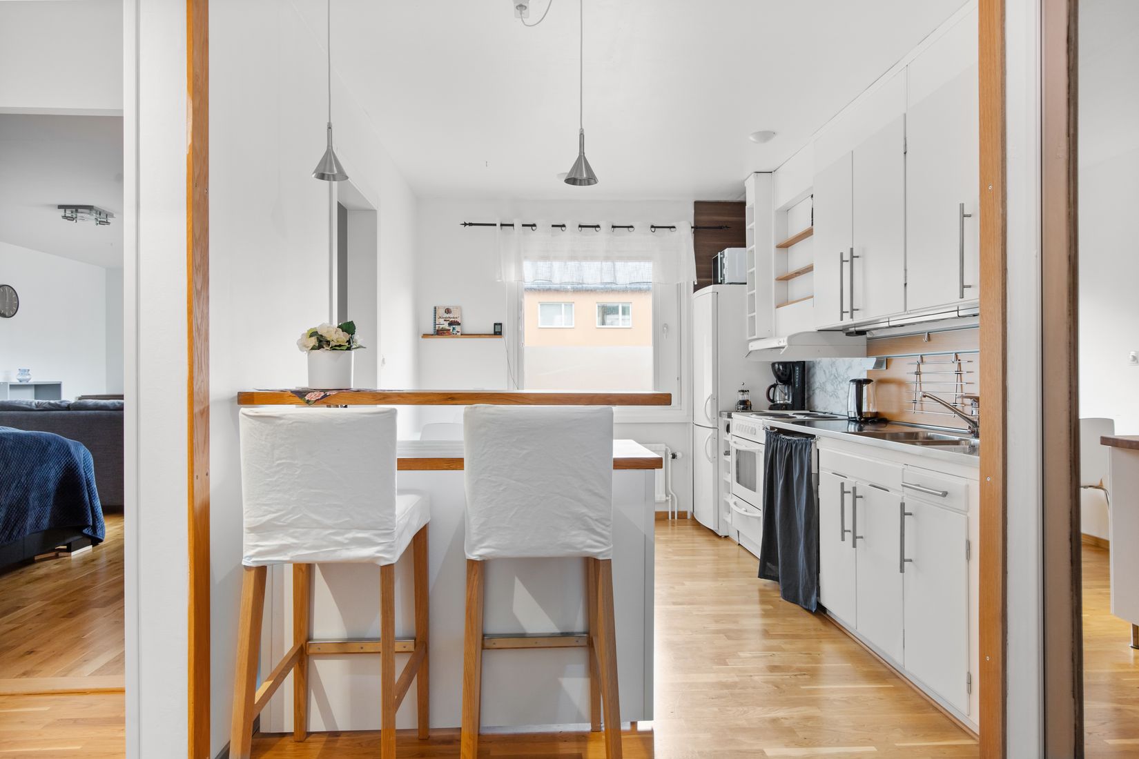 Hall och kök flyter ihop i en öppen, social yta där köksön med barstolar blir hemmets självklara samlingspunkt. Köket går i stilrent vitt med gott om förvaring och en härlig känsla av rymd. Från köket öppnar sig vardagsrummet där du får plats med både en rejäl säng och en skön soffhörna – allt i ett fint flöde.