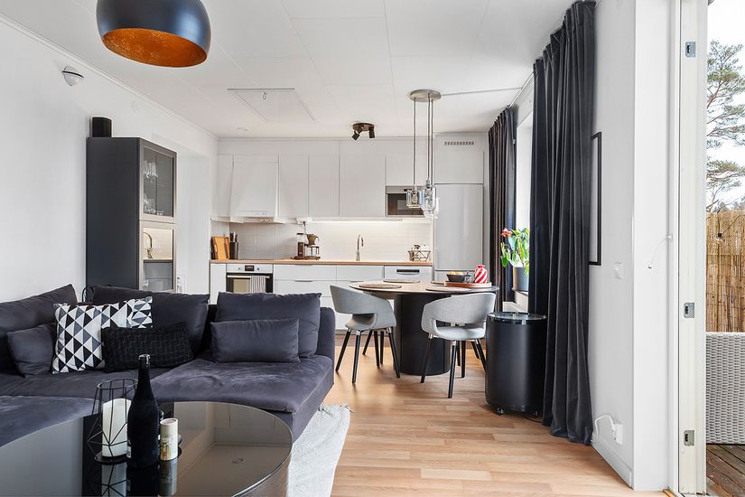 Det fräscha köket är utrustat med moderna vitvaror och praktiska arbetsytor som underlättar vardagen och vid fönstret finns en naturlig plats för matbord. Med en öppen planlösning har du i direkt anslutning vardagsrummet som ger plats för större soffgrupper. Naturlig plats för möblering finns i vardagsrummets hörn. Genomgående så omfamnas bostaden av ett charmigt laminatgolv i kombination med stilrena vita väggar och tak som ger en ljus och harmonisk känsla. Genom vardagsrummet hittar du till balkongen som har plats för möblering och som ger rikligt med sol under hela dagen. Perfekt för att avnjuta en morgonkaffe såväl som för sena sommarkvällar.