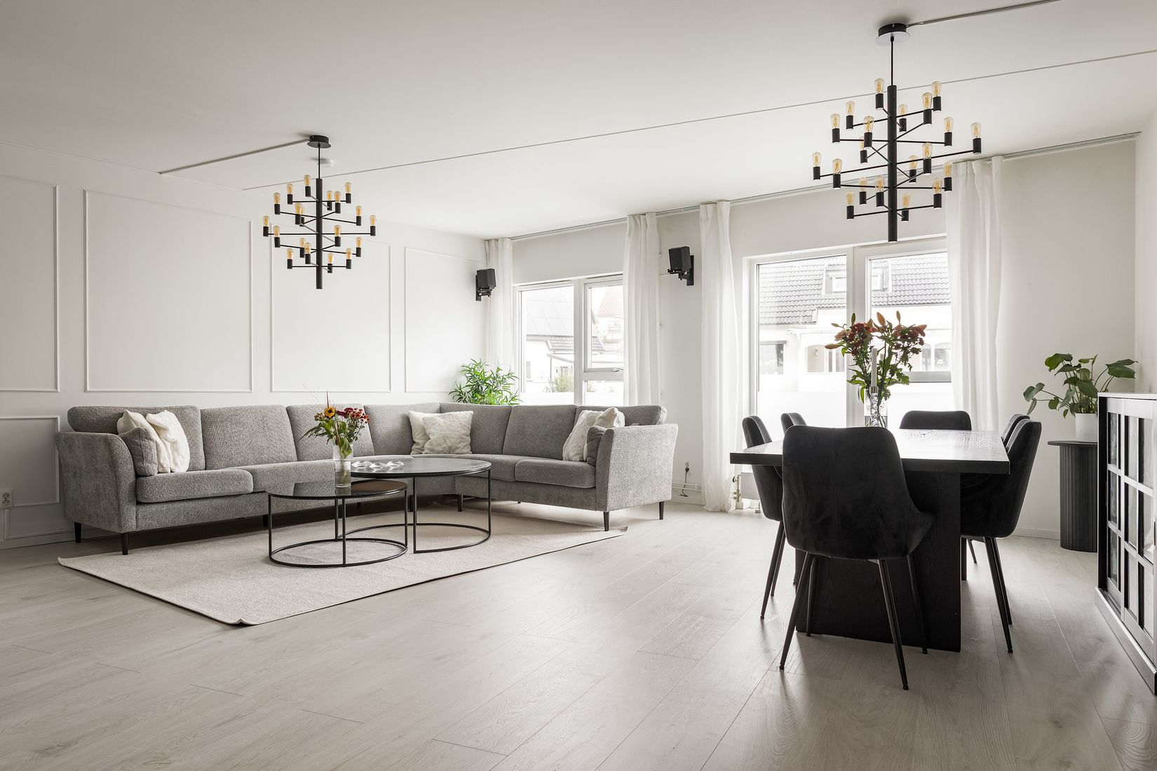 Bostadens hjärta är det öppna vardagsrummet med generös matplats och ett smakfullt kök i mörka toner. Här skapas en perfekt balans mellan elegans och hemtrevnad – en plats för både middagar och avkoppling. Från köket nås en praktisk uteplats som ramas in av lummig grönska och erbjuder sol under stora delar av dagen.