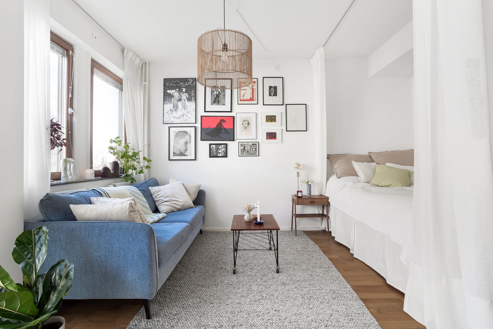 En varm och välkomnande känsla välkomnar oss i entréhallen som erbjuder plats för avhängning av kläder och skor samt hallmöbel. Här finns också förvaringsmöjligheter i platsbyggda garderober. Intill entréhallen når vi det moderna badrummet med påtaglig hotellkänsla. Här är smakfullt inrett med grå klinkers på golvet och vitt kakel på väggarna. Wc, tvättställ med kommod, spegel med inbyggd belysning och duschhörna. Stilsäkert och väl tilltaget kök från Vedum. De vita släta luckorna kombineras fint tillsammans med det vita stänkskyddet och arbetsbänken i laminat. Den maskinella utrustningen består av induktionshäll, integrerad diskmaskin, ugn samt kombinerad kyl/frys. Här går det med enkelhet att bjuda in till middag för flertalet gäster runt matbordet, precis in till det stora fönsterpartiet med härlig utsikt. Vidare i bostaden möts vi av ett strålande ljusinflöde i det sociala sällskapsrummet som erbjuder flera olika alternativ för möblemang. Låt fantasin flöda och skapa ditt drömhem. Här finns det gott om plats för soffgrupp, tillhörande soffbord, rymlig matplats och separat sovalkov med plats för 1,40 säng.