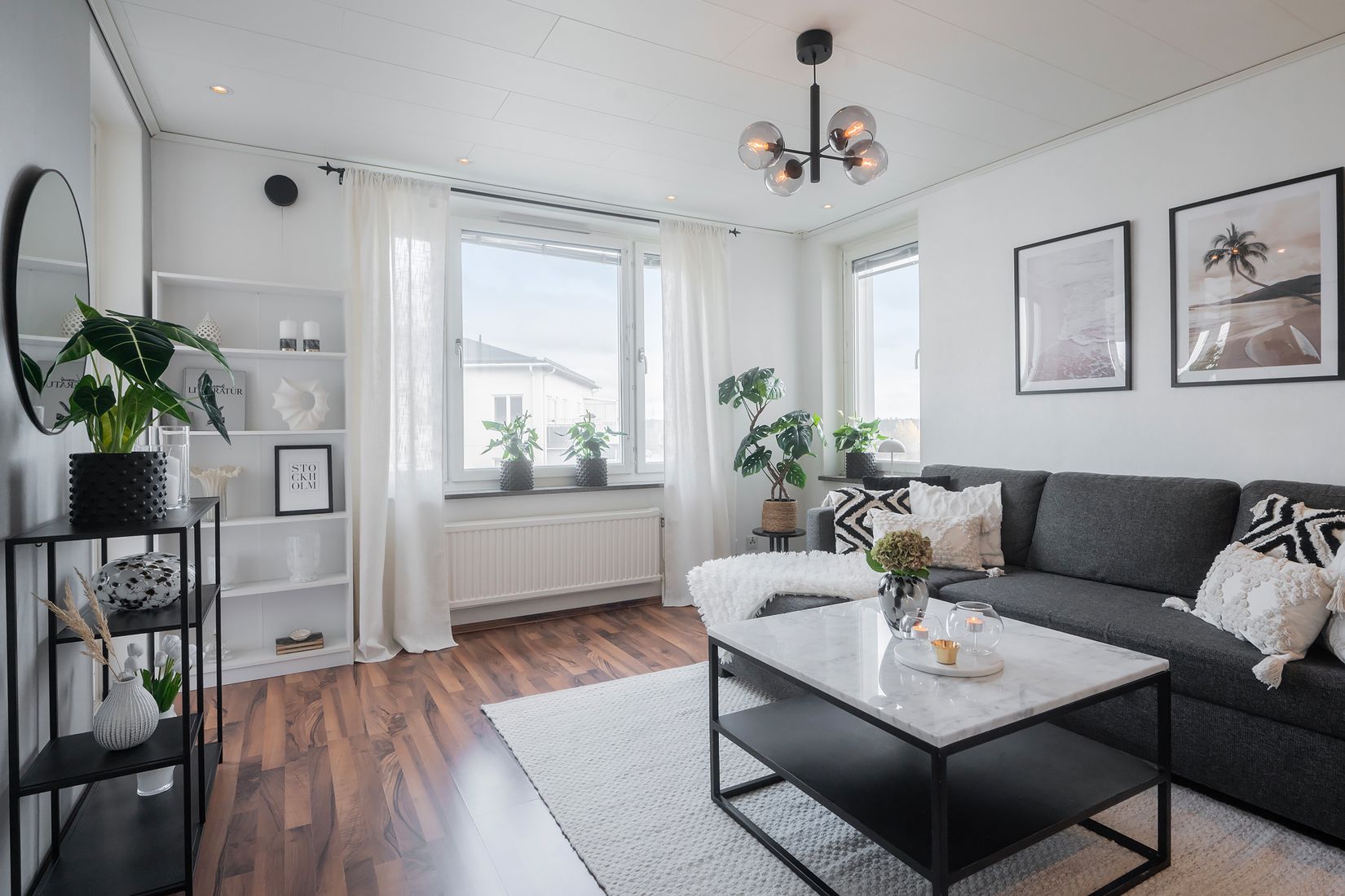 Köket är en riktig pärla - modernt och funktionellt med eleganta vita skåpsluckor, stilrena vitvaror och allt du behöver för att laga mat med glädje. Intill väntar ett luftigt vardagsrum med stora fönster i flera väderstreck som släpper in generöst med ljus och skapar en härligt inbjudande atmosfär. Här finns också en mysig sovalkov som rymmer en bekväm dubbelsäng - en perfekt plats för vila och återhämtning.