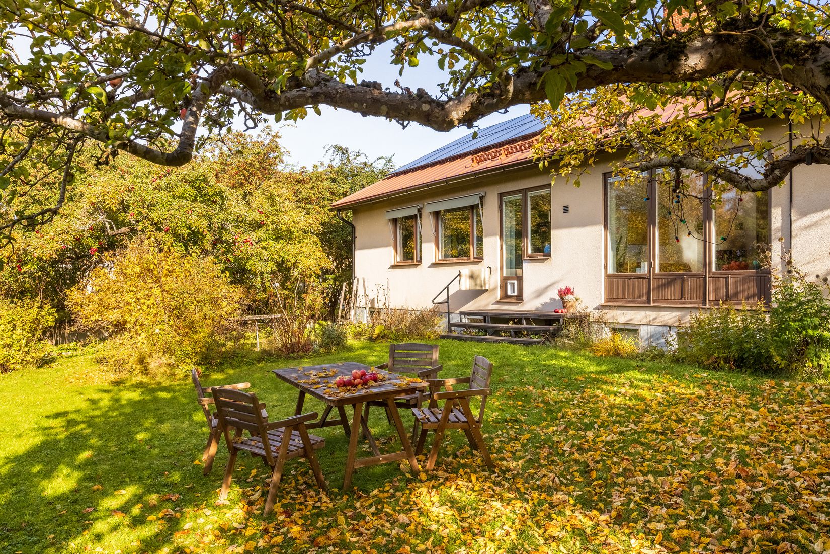 Den uppvuxna tomten om 934 kvm upplevs insynsskyddad och har sin huvudsakliga yta vänd mot väst vilket ger ett mycket bra solläge härifrån. Förutom fruktträd kan nämnas att det under försommartid bildas en mycket vacker, ängsliknande gräsmatta täckt av en mängd gullvivor, scilla och prästkragar.