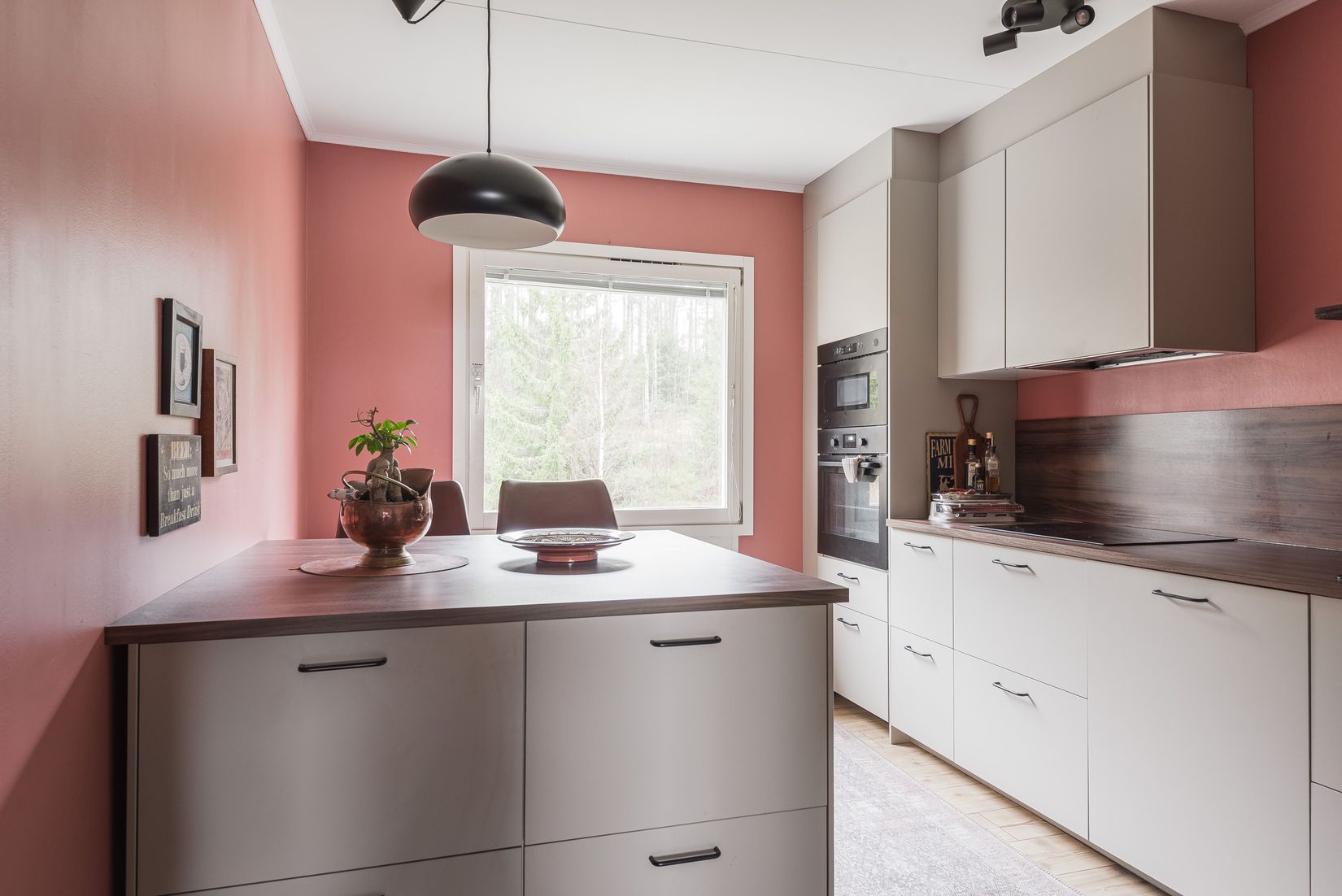 Det moderna köket renoverades för bara ett par år sedan och erbjuder gott om förvaring, fina arbetsytor och en härlig utsikt mot skogspartiet bakom huset.