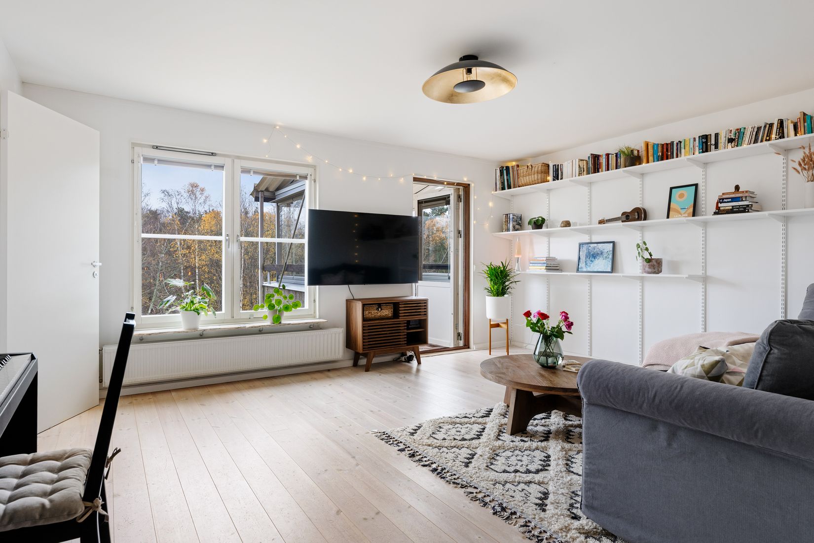 Från det ljusa och lättmöblerade vardagsrummet nås bostadens inglasade balkong som bjuder på en lummig utsikt med ett solläge i sydost för härliga solstunder från morgon till tidig eftermiddag.