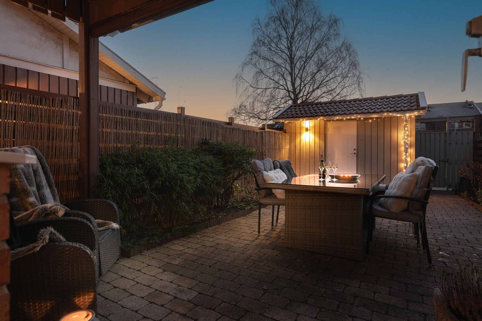Bostaden präglas av ljus, rymd och en genomtänkt planlösning. Direkt i entrén möts ni av ett öppet och inbjudande flöde mellan hall, matplats och kök. Köket är generöst tilltaget med köksö och stora arbetsytor, perfekt för både vardag och sociala tillställningar. Vardagsrummet badar i ljus i gavel mot soliga trädgårdssidan. Gott om plats för både loungegrupp och matbord. Trädgården vetter mot samfällighetens välskötta grönområde, en sluten, trygg och bilfri plats där barnen kan leka fritt, med stor gräsmatta, grillplats och lekplats.