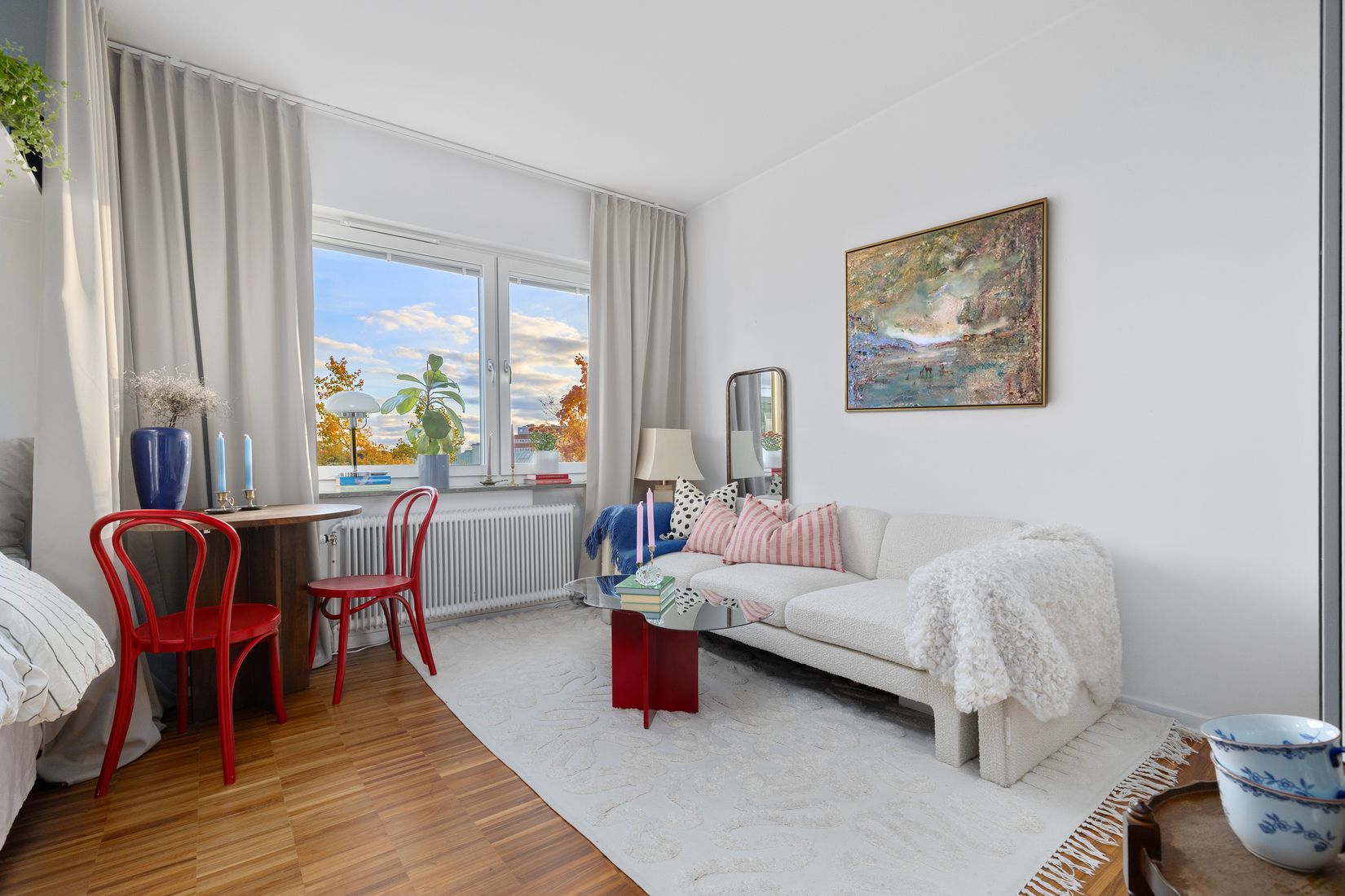 Lägenheten är belägen på våning 2 av 3 med insynsskyddat läge. Generös takhöjd tillsammans med stora fönsterpartier ger ett fantastiskt ljusinsläpp och en härlig känsla av rymd. Sovalkoven har en praktisk loftsäng, men rymmer även en 140 cm-säng eller skrivbordshörna om så hellre önskas. Vardagsrummet erbjuder plats för både soffa och matplats vid fönstret – ett hem att verkligen trivas i.