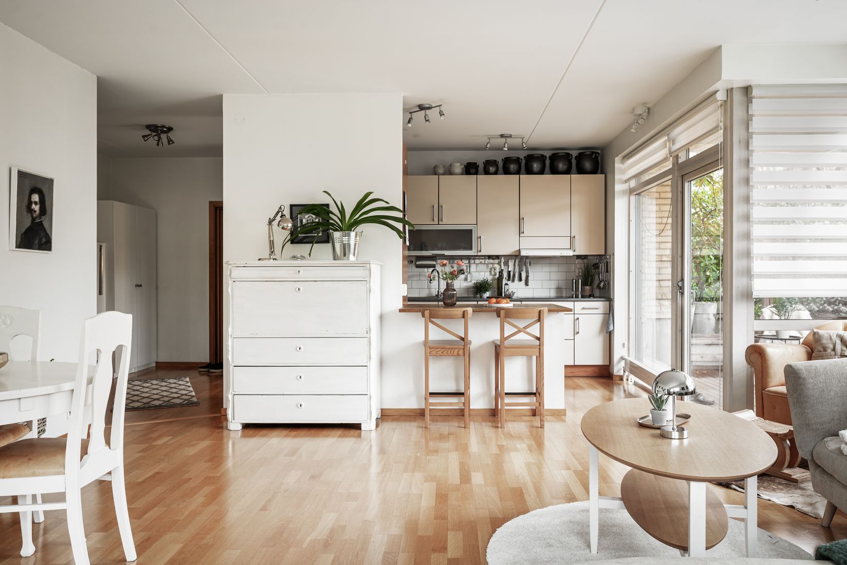 Den öppna planlösningen mellan kök och vardagsrum skapar en social och inbjudande miljö, perfekt för middagar och umgänge. De stora fönsterpartierna släpper in generöst med ljus och samspelar fint med de ljusa ytskikten och den enhetliga ekparketten som löper genom hela bostaden. Från sällskapsdelen nås den insynsskyddade, lummiga uteplatsen – en naturlig förlängning av vardagsrummet där du kan njuta av soliga dagar och middagar i det gröna. De två sovrummen är rymliga och erbjuder goda förvaringsmöjligheter. Badrummet är helkaklat och utrustat med tvättavdelning för extra bekvämlighet.