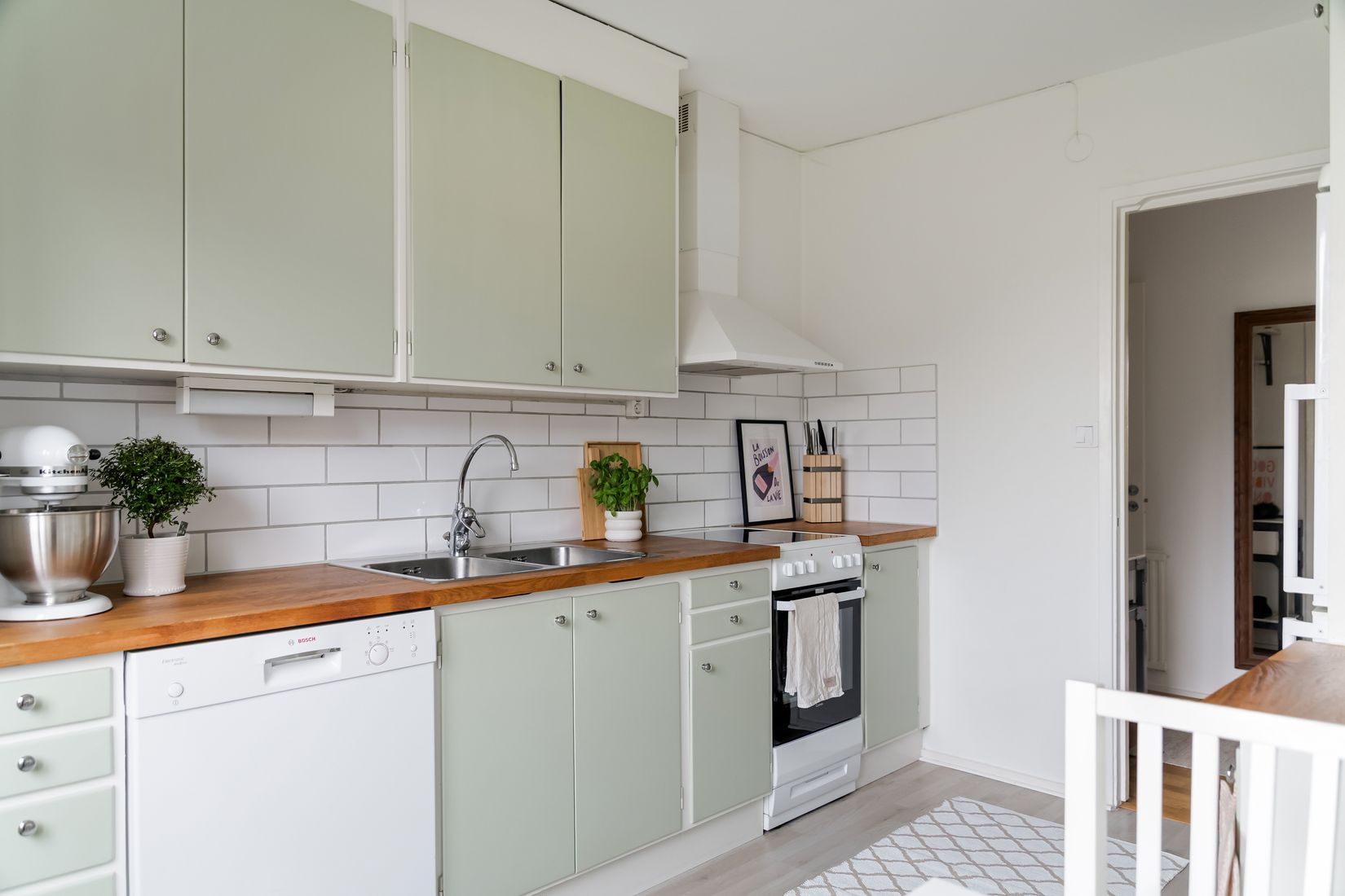 Det gröna, charmiga köket har en härlig karaktär och gott om förvaring bakom skåpsluckor i dämpad ton. Träbänkskivan ger en varm känsla, och här finns plats för ett matbord intill fönstret – perfekt för vardagens måltider eller en lugn kaffestund. Ljust och härligt vardagsrum med gott om plats för både soffhörna och matplats. Härifrån nås den trevliga balkongen – perfekt för att njuta av en kopp kaffe eller kvällssolens sista strålar. Vidare har vi ett ljust sovrum med plats för dubbelsäng samt god förvaring i garderoberna. Helkaklat badrum med dusch, handfat med kommod, WC och praktisk tvättmaskin.