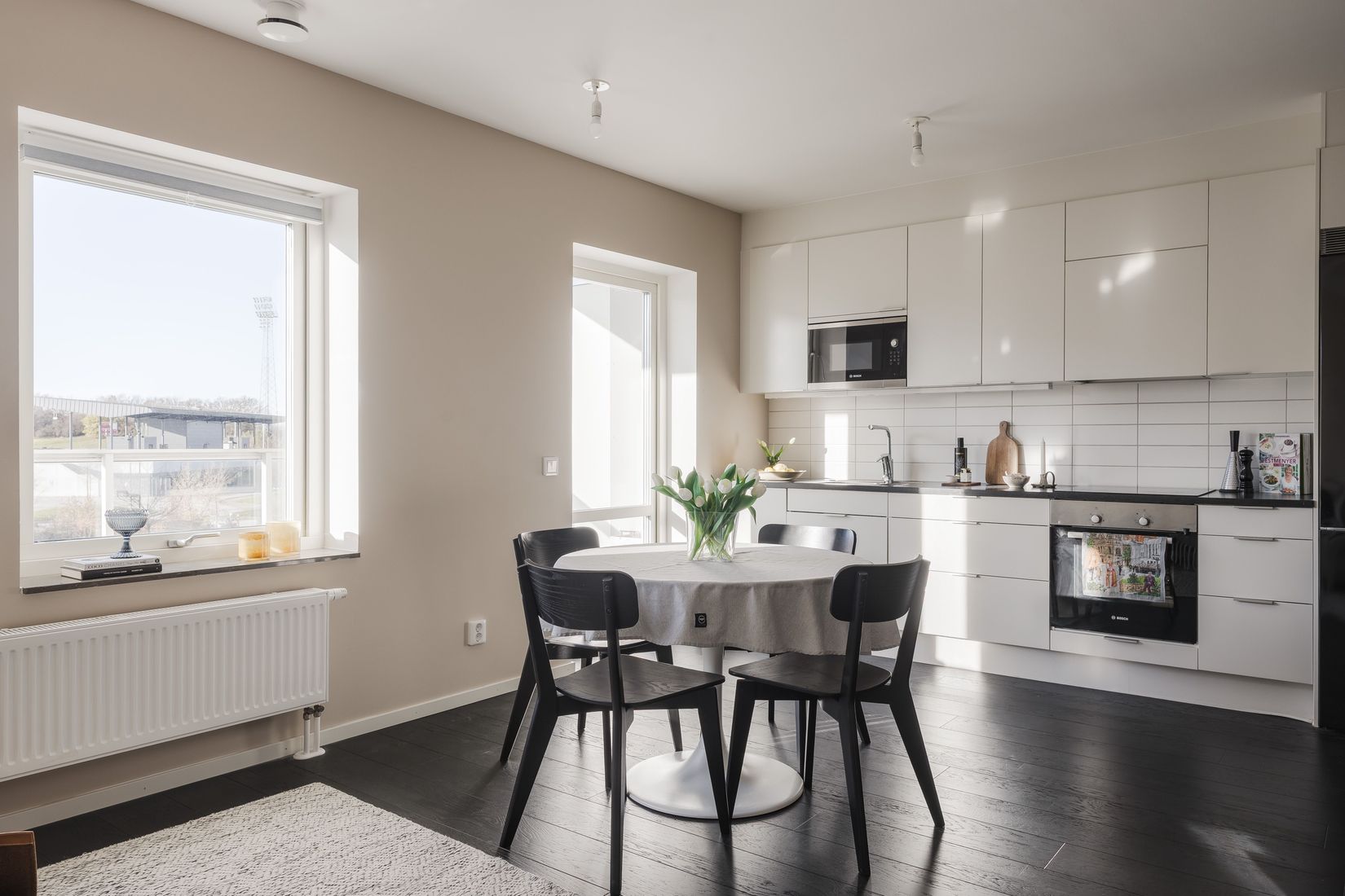 I det smakfulla Vedum-köket förenas design och funktionalitet på bästa sätt. De vita släta köksluckorna kombineras med en maskinpark från Bosch och gott om förvaringsutrymme. Här finns plats för matbord och naturligt ljus som flödar in från vardagsrummets fönster.