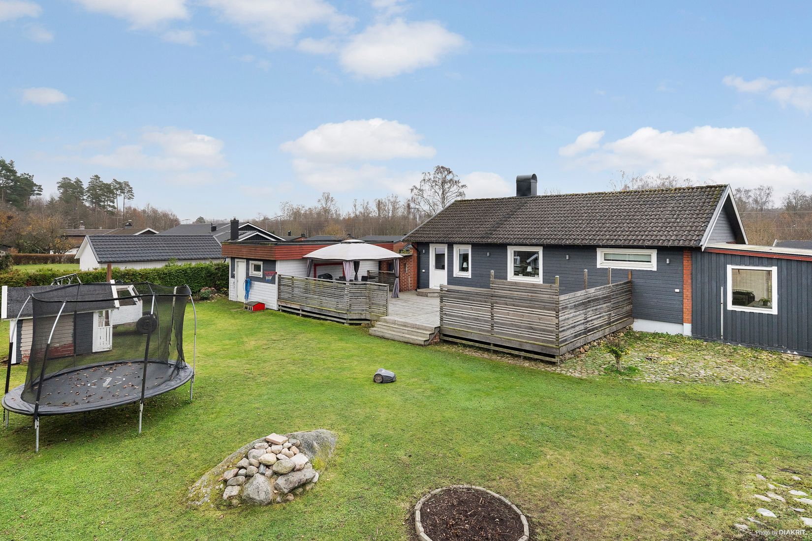 Tomten är generös och insynsskyddad med en altan på baksidan och en rymlig gräsyta som lämpar sig för avkoppling, lek och sociala tillställningar.