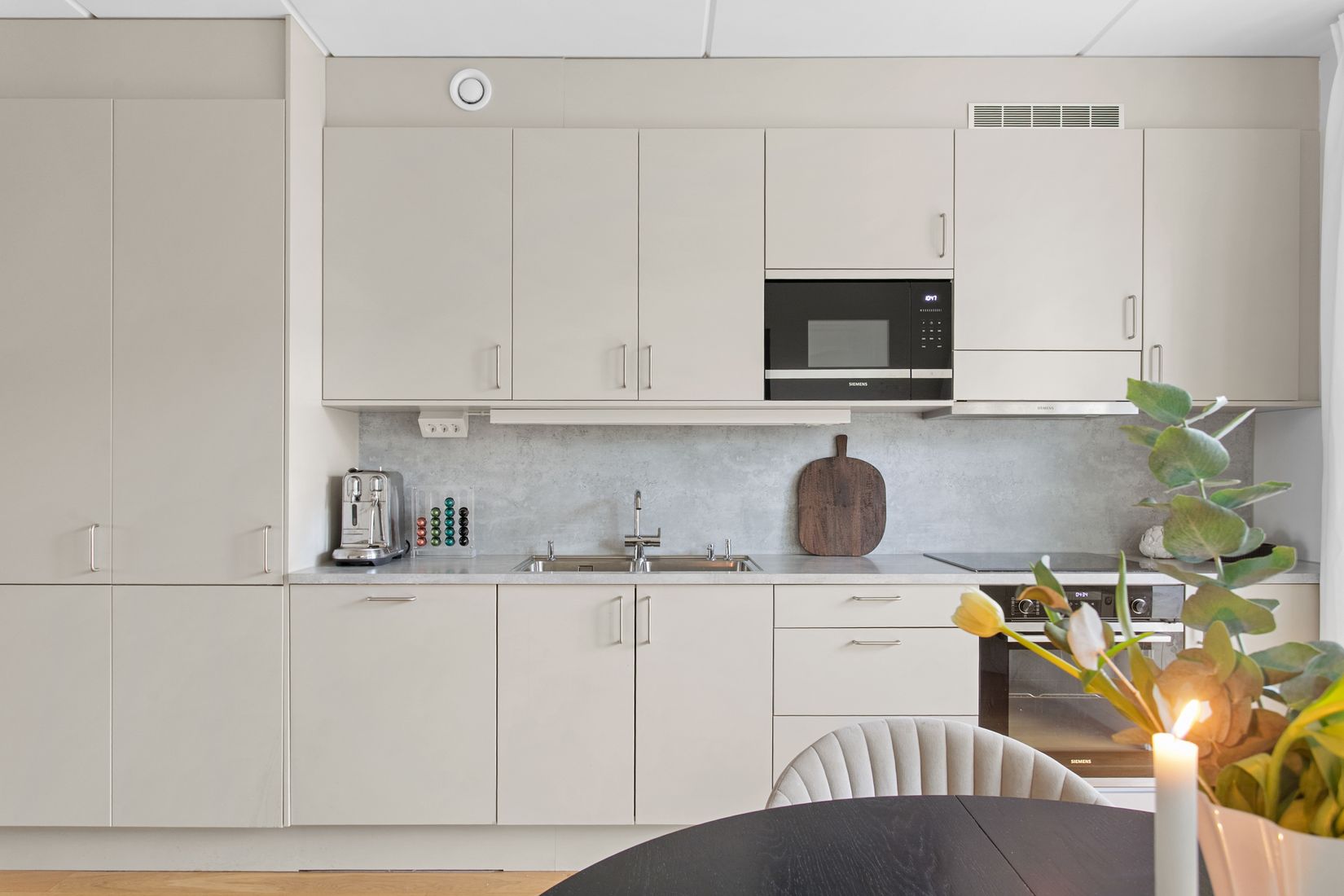 Det generösa vardagsrummet bjuder på plats för en rejäl soffgrupp och har utgång till en av lägenhetens två balkonger – perfekt för avkoppling i eftermiddagssolen. Köket från Mabodal är stilrent och utrustat med allt du kan önska dig och lite till, med integrerade vitvaror, gott om förvaring samt plats för en matgrupp som bjuder in till sociala middagar. Från köket når du den andra balkongen.