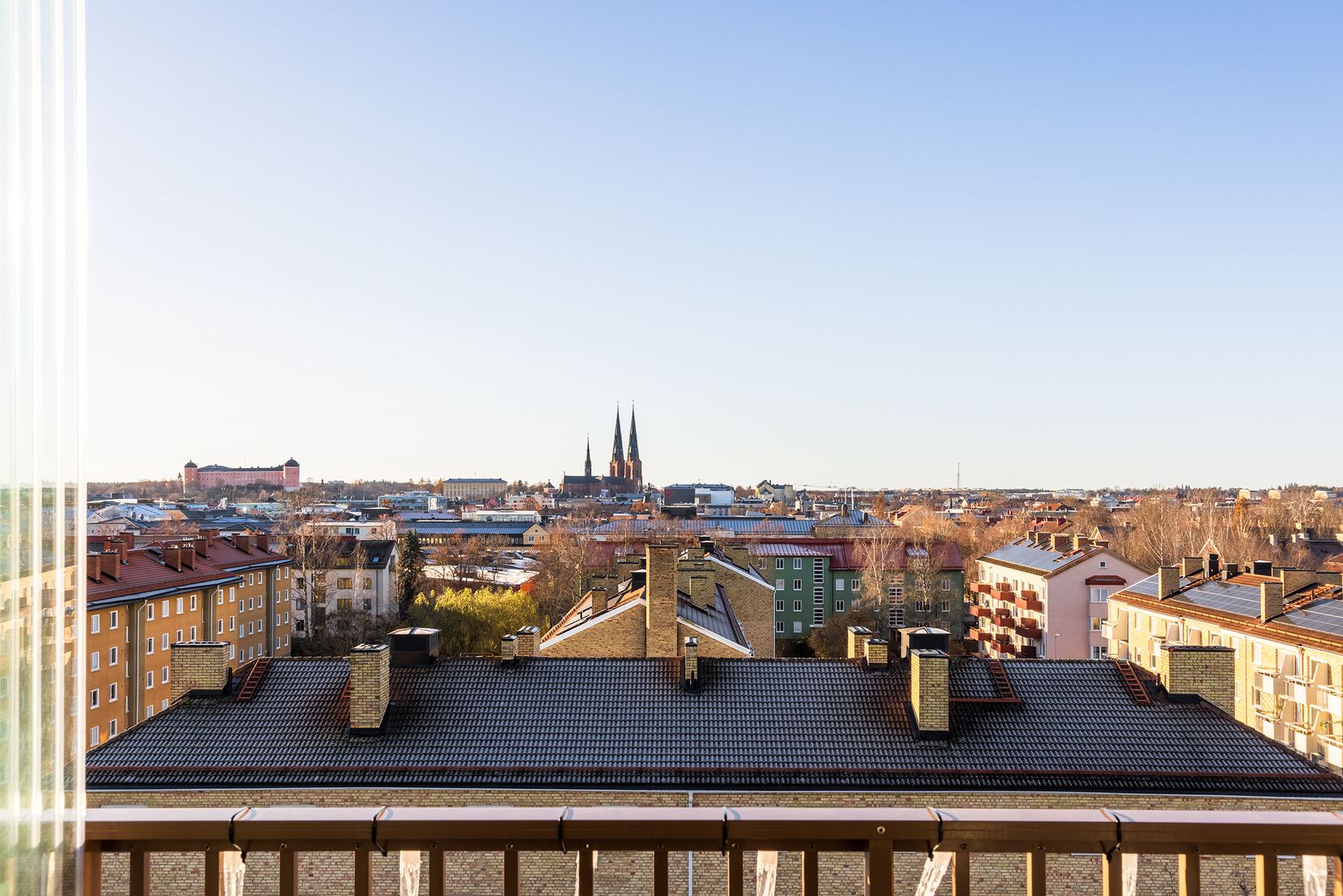 Bostaden ligger i ett trivsamt gavelläge på våning åtta, med hiss från markplan och stora fönsterpartier som släpper in ett fantastiskt ljus från tre väderstreck. Den inglasade och rymliga balkongen bjuder på utsikt som verkligen imponerar, med vyer över Uppsala stad, UKK, Domkyrkan, Slottet och Carolina Rediviva. En plats att njuta av året runt.