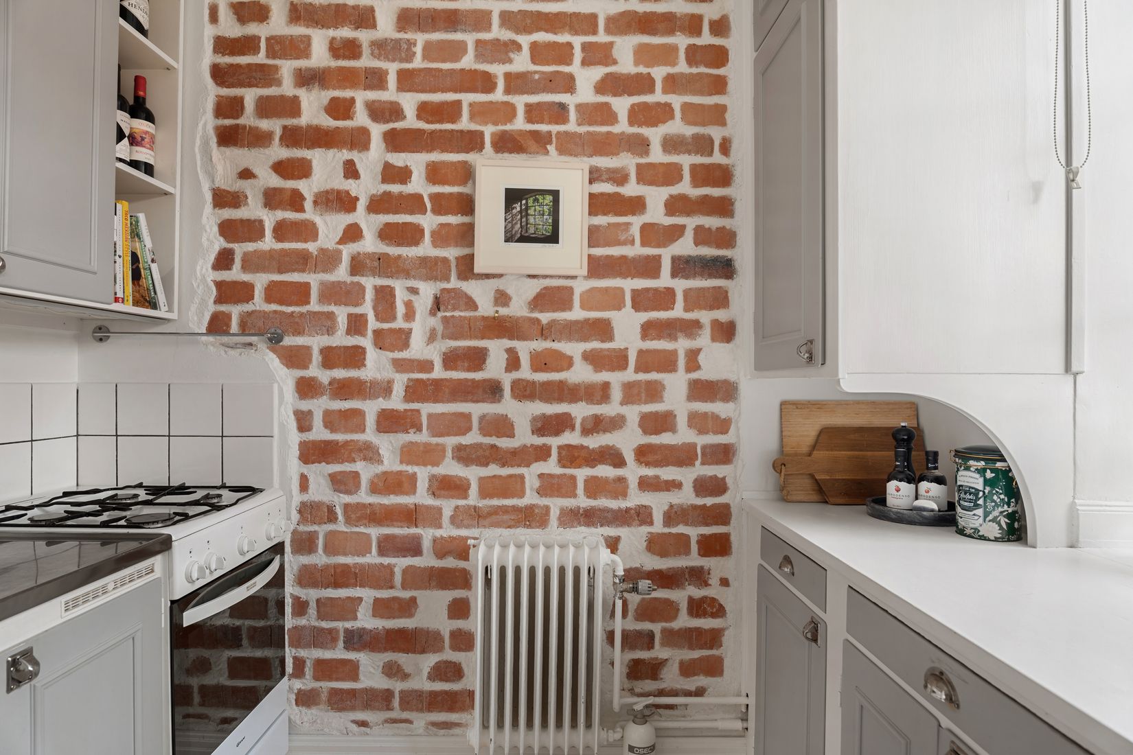 detaljer så som vackra stuckaturer, generös takhöjd, luckor i original samt framtagen tegelvägg. Lägenheten erbjuder en bra planlösning, gott om förvaring ett härligt ljusinsläpp. Lägenheten har även målats om och golven är slipade. Till lägenheten hör ett stort vindsförråd med möjlighet till gott om förvaring och det finns tillgång till extra källarförråd utan extra kostnad.