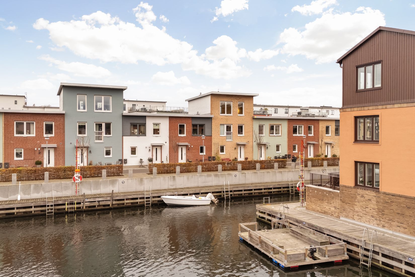 På övre plan finns bostadens privata del med tre sovrum och ett allrum (möjligt extra sovrum) samt badrum. Master bedroom har skjudörrsgarderob och utsikt mot kanalen.