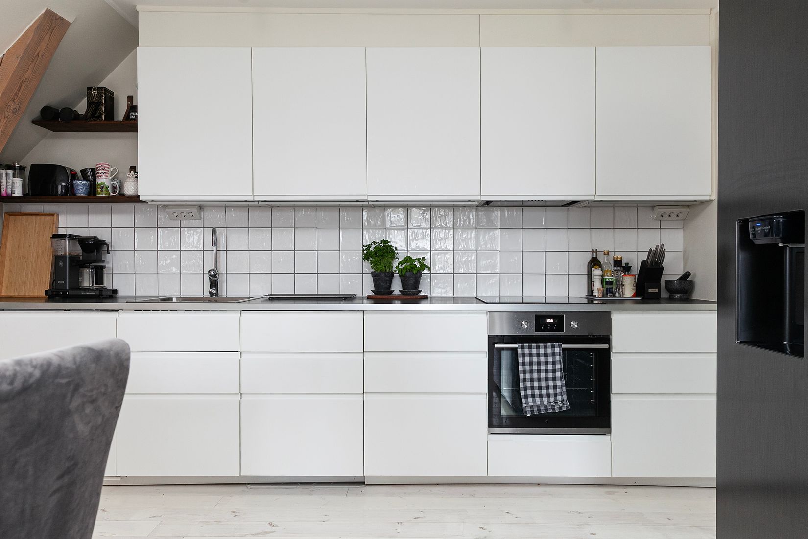 Med vita bredspacklade väggar och vitlaserade trägolv skapas en ljus och fräsch atmosfär, där de framtagna stödbenen adderar en unik karaktär till bostaden. Här finns en förening som erbjuder en gemensam balkong och en trädgård med trädäck – perfekta platser för att njuta av soliga dagar eller stjärnbeströdda kvällar.