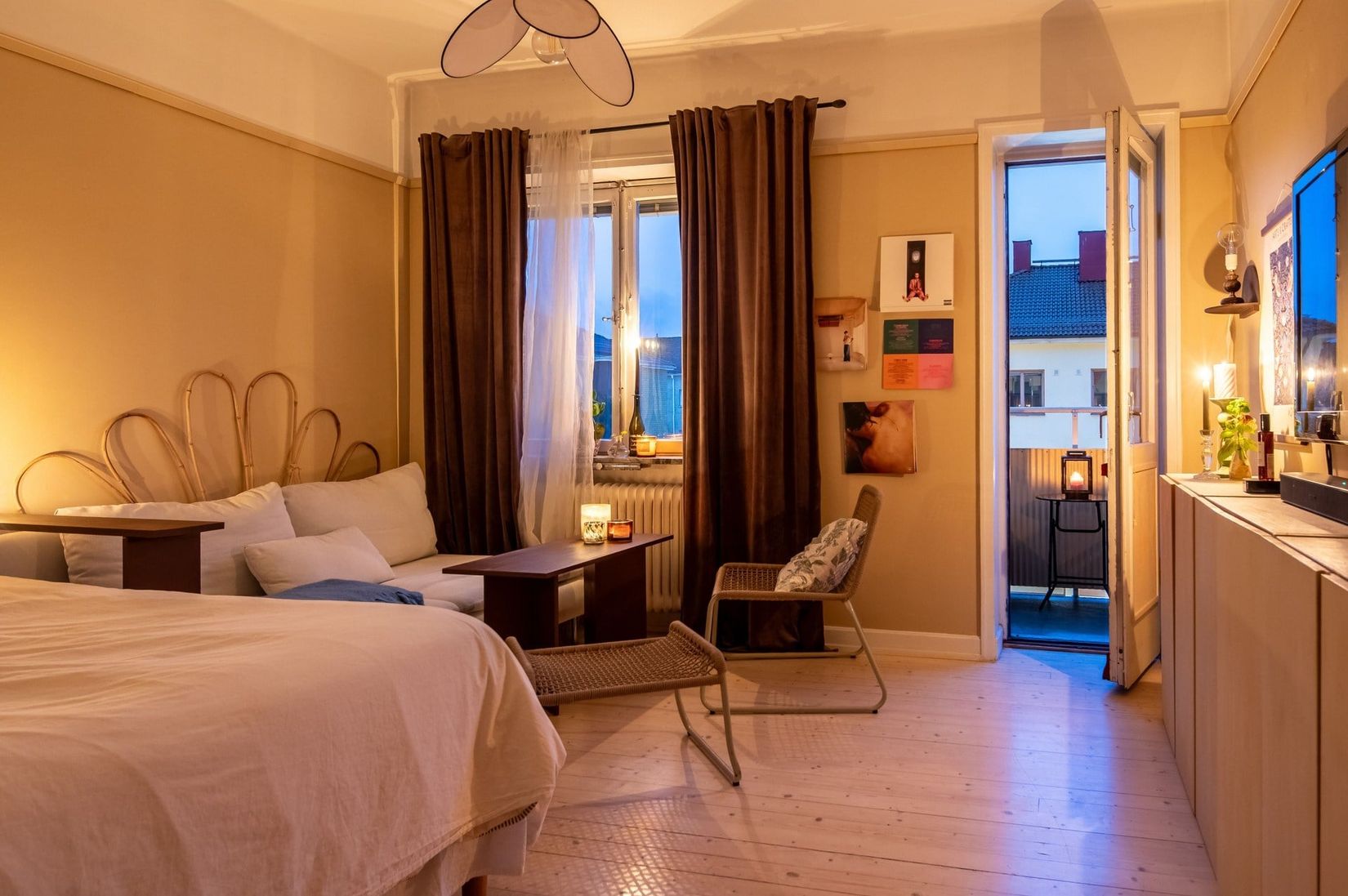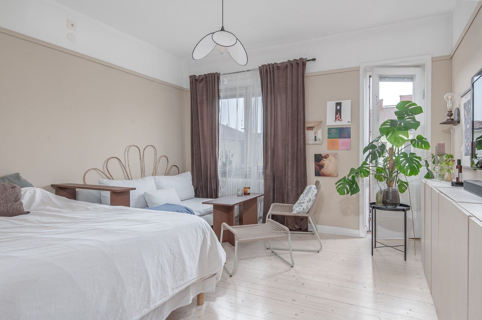 Här möts du av en rymlig hall med praktiska dubbelgarderober som ger gott om förvaring. Vardagsrummet erbjuder generöst med plats för både soffa och säng, och från rummet når du den soliga balkongen i perfekt söderläge – en given favoritplats under årets varmare månader.