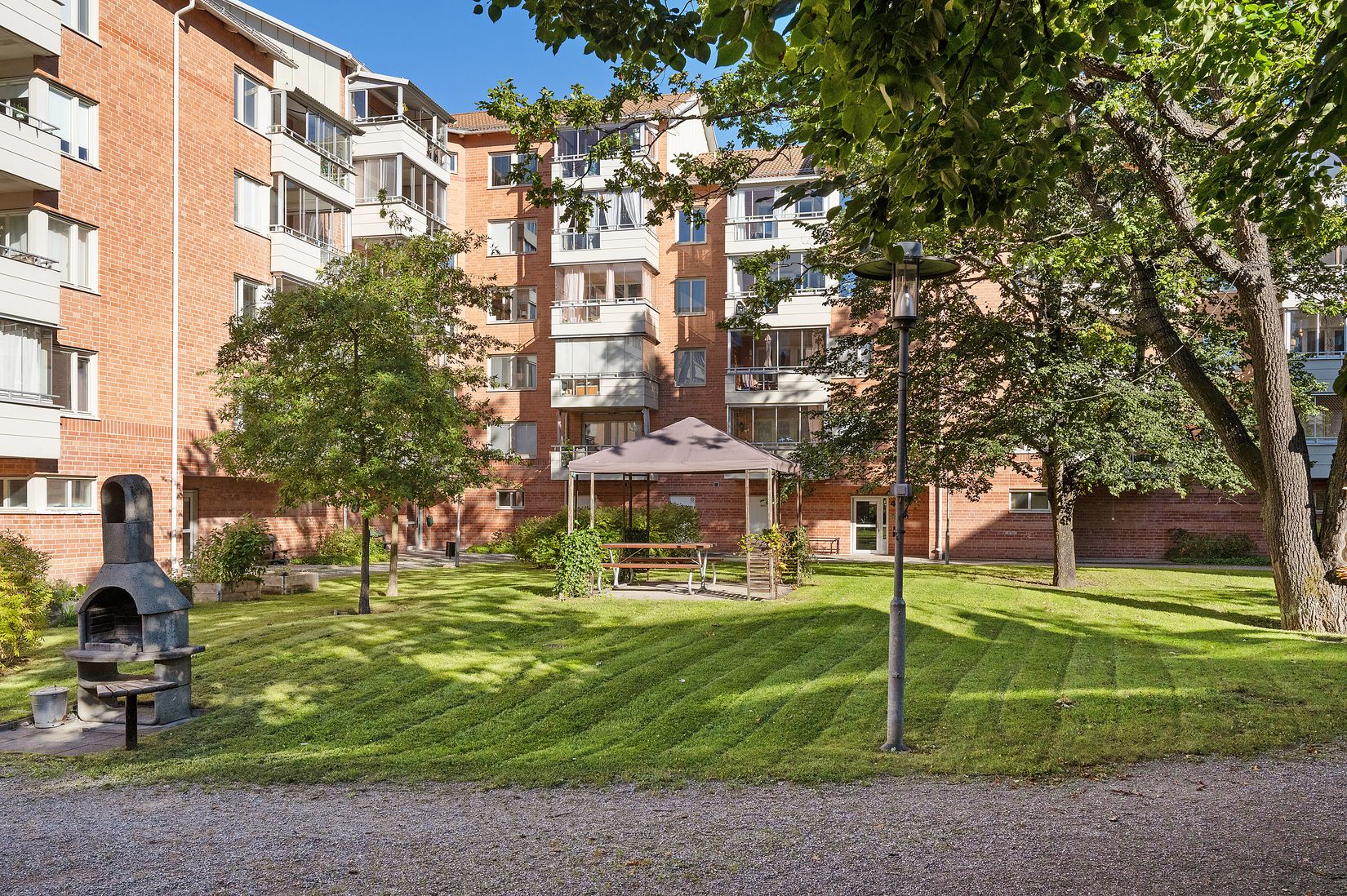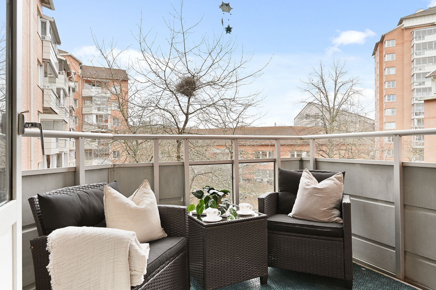 Rymlig balkong, perfekt för morgonkaffet eller kvällsmys året runt. Utsikt mot lummig innergård och sol morgon/förmiddag.