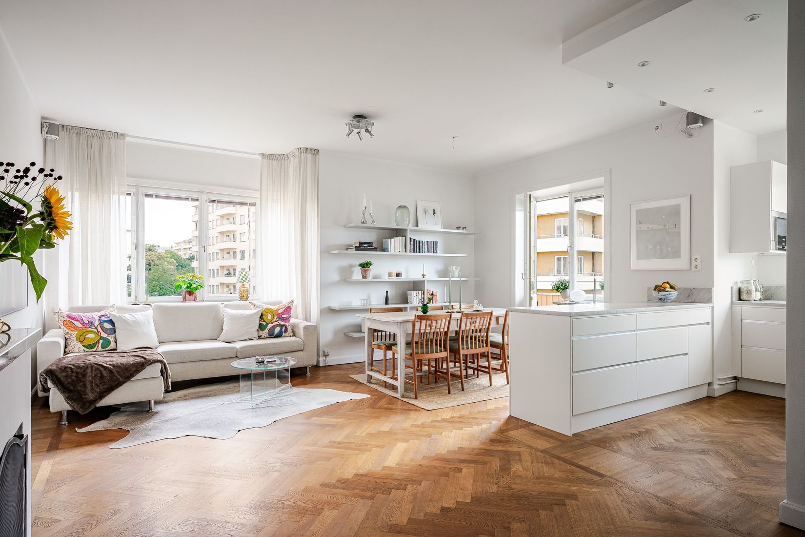 Lägenheten är smakfullt renoverad i sobra färger och har ett enhetligt uttryck som känns både modernt och tidlöst. Du möts först av en praktisk hall med klädkammare, som leder vidare in i det öppna och sociala vardagsrummet med kök i direkt anslutning. Den fina öppna spisen blir en naturlig samlingspunkt under kalla dagar, medan generösa fönsterpartier i två väderstreck fyller bostaden med naturligt ljus och förstärker känslan av rymd. Det genomgående fiskbensparkettgolvet skapar ett elegant och harmoniskt uttryck i alla rum.