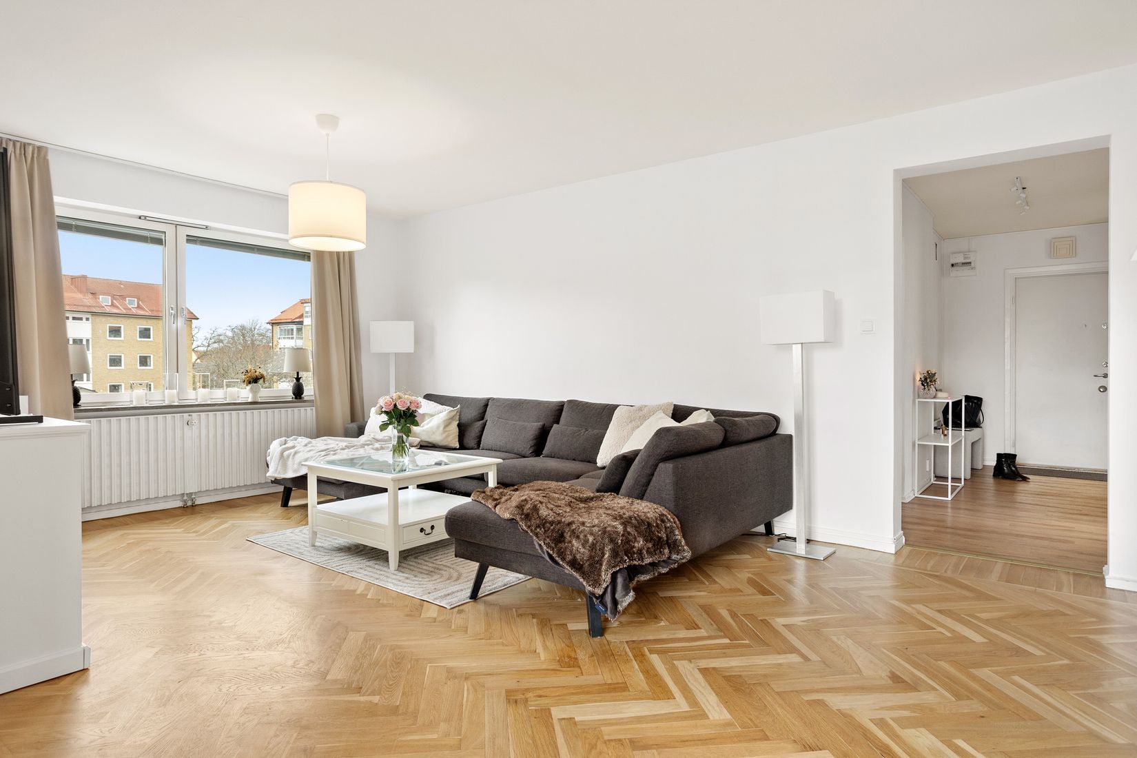 Det rymliga vardagsrummet är bostadens hjärta, med vackert parkettgolv och gott om plats för både soffgrupp och matsalsmöbel. Härifrån nås den inglasade balkongen i soligt söderläge, som förlänger säsongen och bjuder in till många sköna stunder.