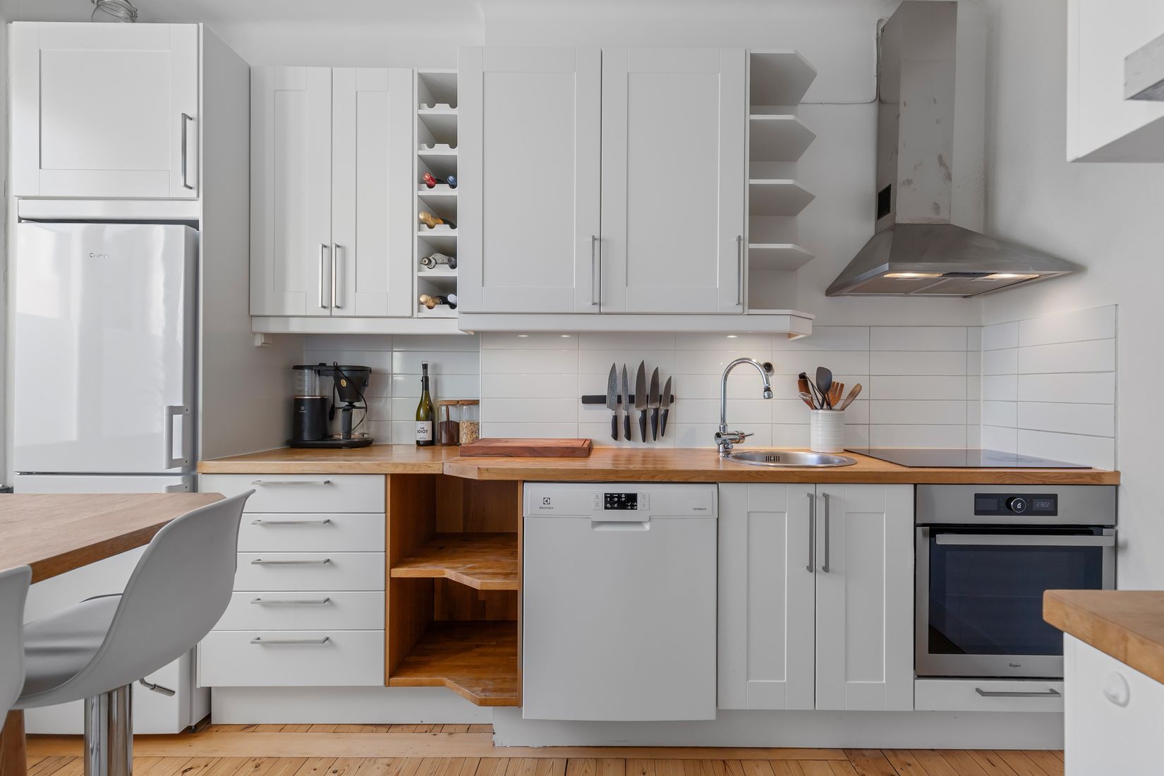 Den inbjudande hallen erbjuder plats för avhängning och förvaring i praktisk och mycket djup klädkammare. Vardagsrummet kan lätt möbleras med både soffa och matbord och rummet får ljus och rymd från stort fönsterparti. Sovrummet har plats för både säng och förvaringsmöbel. Via sovrummet nås köket som är utrustat med kombinerad kyl och frys, diskmaskin, spishäll, inbyggnadsugn och kolfilterfläkt. Lägenhetens badrum är inrett med dusch och här finns plats för att installera en mindre tvättmaskin om så önskas. Lägenheten disponerar dessutom två förråd i källaren.