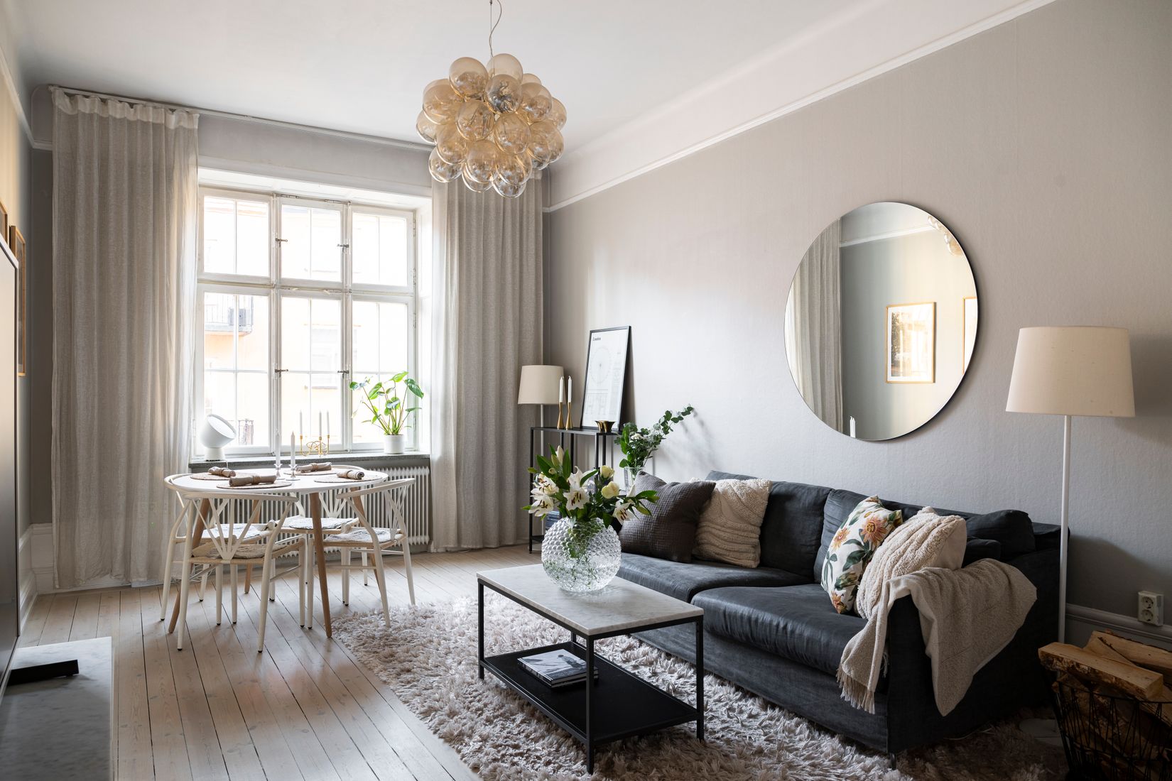 Den genomgående planlösningen och de generösa fönsterpartierna ger ett härligt ljusflöde genom hela lägenheten. Inredningen är stilren och ljus med vackra trägolv som löper genom rummen. Från sovrummet nås en solig balkong med härligt läge.
