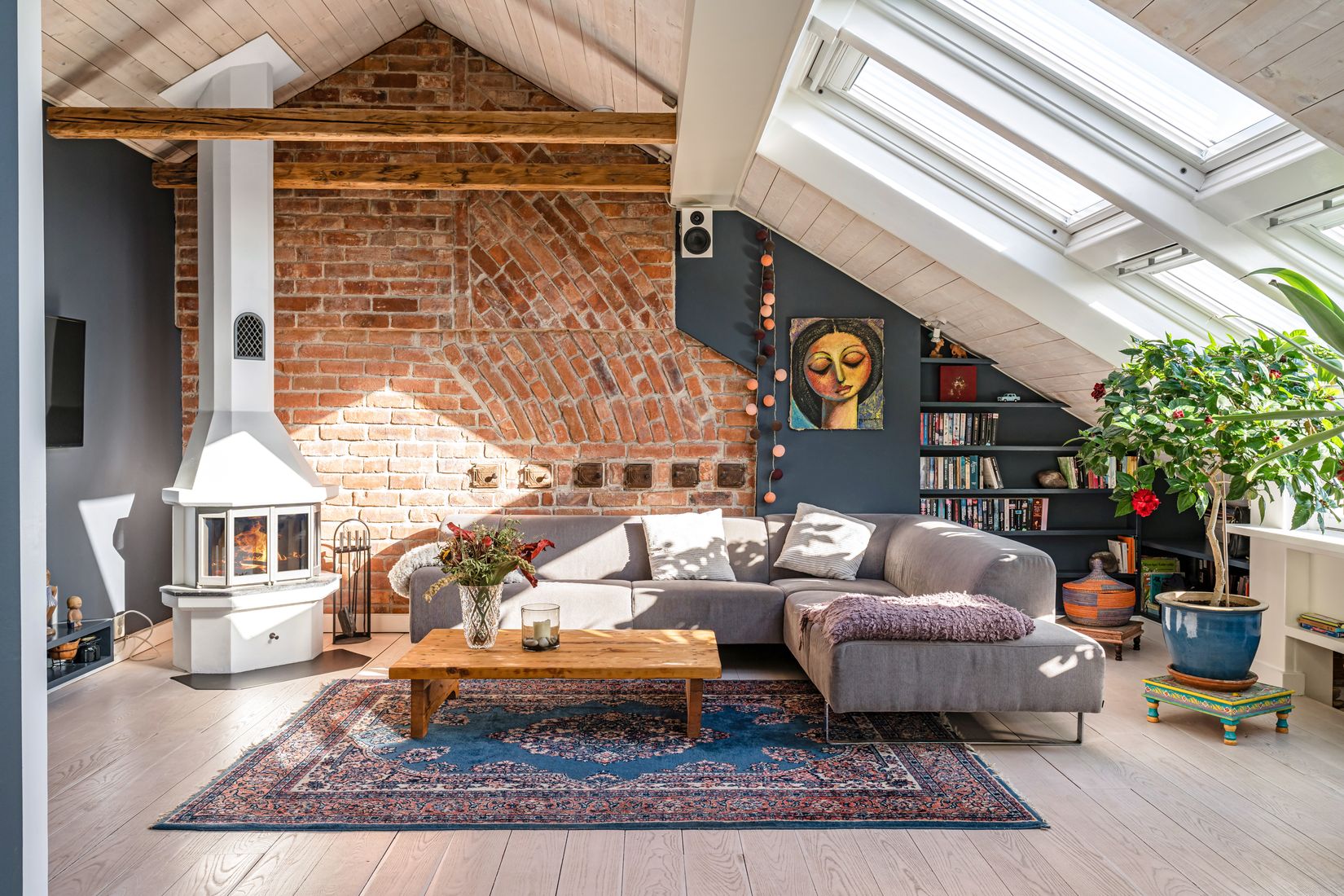 Invändigt möts du av en social och välplanerad planlösning där generösa glaspartier, takfönster och vackra synliga takbjälkar skapar en unik karaktär och låter ljuset flöda genom hela bostaden. De öppna siktlinjerna ger en luftig känsla och binder samman rummen på ett naturligt sätt. I vardagsrummet står den charmiga braskaminen– en vacker blickpunkt som skänker både värme och atmosfär.