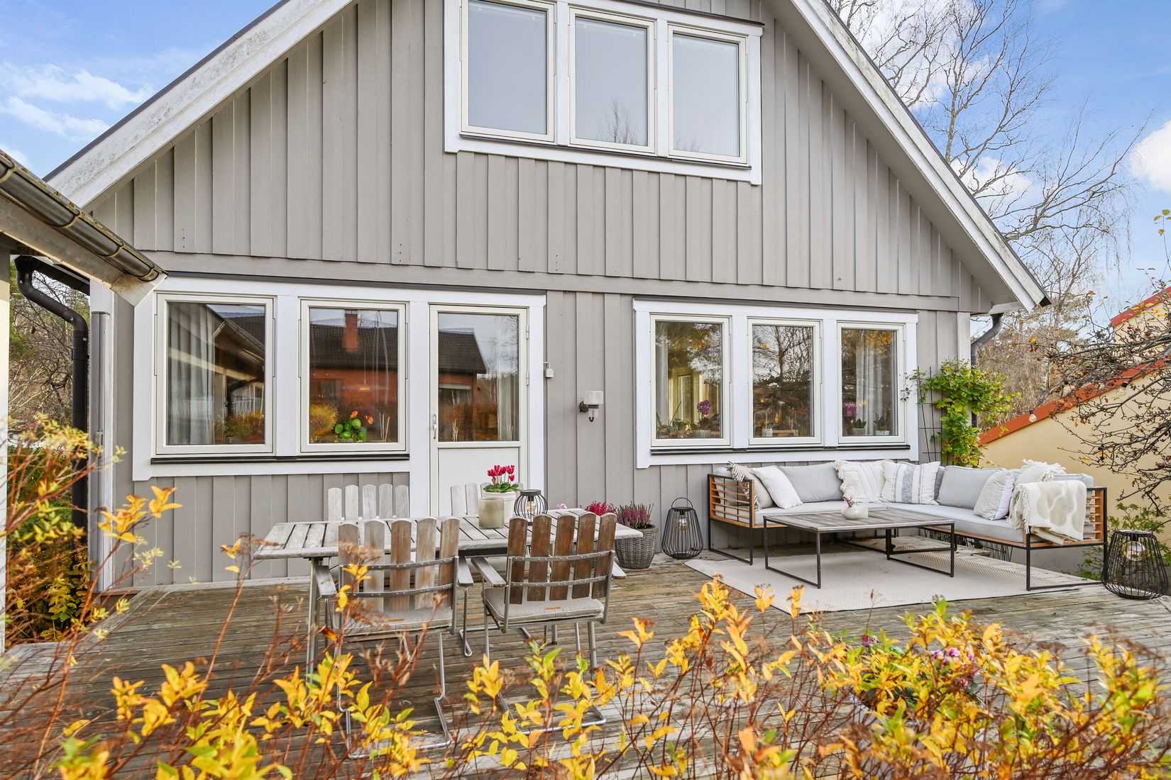 Entréplan består av en välkomnande hall, vardagsrum med plats för både soffgrupp och matsalsmöbler, stort kök med matplats och utgång till den trädäckade uteplatsen med sol hela dagen och kvällen. På entréplan finns också 2 sovrum, badrum och separat gästtoalett samt tvättstuga med groventré. Övre plan med stort allrum med takkupa och utgång till balkong i söder. Här finns i dag 2 stora sovrum som enkelt kan delas av till ytterligare sovrum, ett badrum och gott om förvaring i kattvindar och 2 klädkammare.