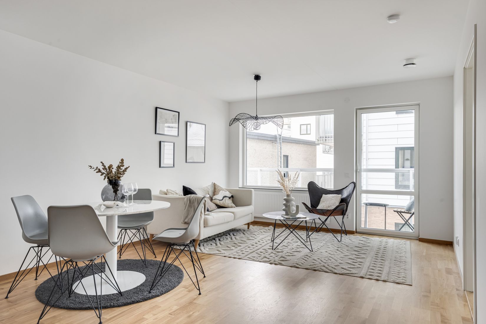 Det stilrena och moderna köket erbjuder generösa arbetsytor, bra förvaring och en design som smälter perfekt in i bostadens öppna och ljusa helhet. Vardagsrummet är lättmöblerat och har direkt access till den mysiga franska balkongen, där två personer bekvämt kan njuta av den rofyllda utsikten över det natursköna kalkbrottet.