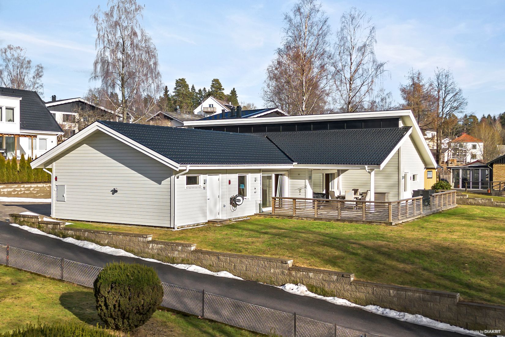 Huset inramas av en plan och rymlig tomt som inbjuder till lek och spring.