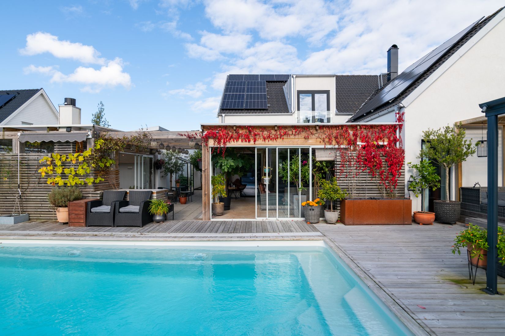 Den stora och ljusa villan om 220 kvm och nio rum byggdes 2013. Genom hela bostaden löper en mycket stilsäker designlinje präglad av de vackra sten, stora fönsterpartier samt rika inslag av takhög ribbträpanel. Entréplanet har till stor del öppen planlösning med matsal och sobert kök i förbindelse med de tidlöst ljusa och vackra sällskapsytorna med fri takhöjd och öppen spis med glas åt två håll. På detta plan finns en klassisk master bedroom-svit med walk-in-closet och stilsäkert badrum. Här nere finns även ytterligare ett sovrum, gäst-wc samt en groventré med klädvårdsavdelning. En ektrappa leder upp till det överraskande stora och ljusa allrummet som förbinder till två sovrum, ett sobert badrum samt en walk-in-closet. Häruppe faller ljuset in från flera stora takfönster. Även på detta plan kommer designlinjens partier med stående ribbträpanel igen vilket bidrar med värme och organisk atmosfär. Den öppna transparensen mot villans smått magiska trädgård är en stor del av bostadens själ. Utanför glaspartierna i entréplanets vinterträdgård och kök tar stora ytor med trädäck över, inramade av bambu och annan grönska. Plankorna är ännu varma efter dagens sol och trägolvet försvinner iväg genom en mängd olika rum och platser under pergolas och tak med klättrande grönska. I kvällssoligt västerläge finns flera loungeytor, ett utespa, ett pooldäck med platsbyggda bänkar och ett komplett utekök med drag av klassisk strandrestaurang. När poolens belysning tänds går tankarna till en internationell semesterresort. Vid villans andra hörn fortsätter trädäcket ut via ett system av träspångar i den stora trädgårdsdelen med asiatisk inspiration. Ytorna är skyddade med ribbträplank och grönska. Även i denna del av trädgården är rumsligheten påtaglig med flera uteplatser, klättrande grönska, planteringar, stensättningar, ytor med svart singel, odlingsbänkar samt ett större växthus.