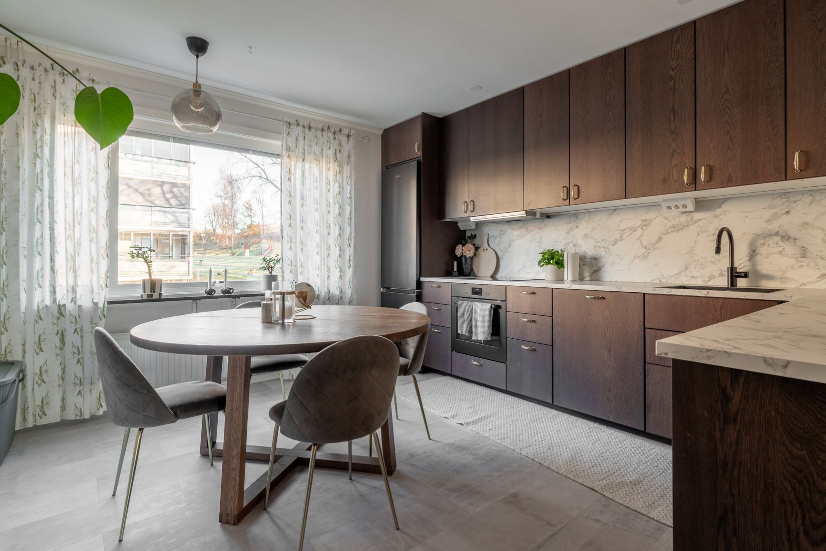Det smakfullt renoverade köket bjuder på fina arbetsytor, moderna materialval och naturligtvis plats för en matgrupp, perfekt för både vardagsmiddagar och umgänge med vänner.