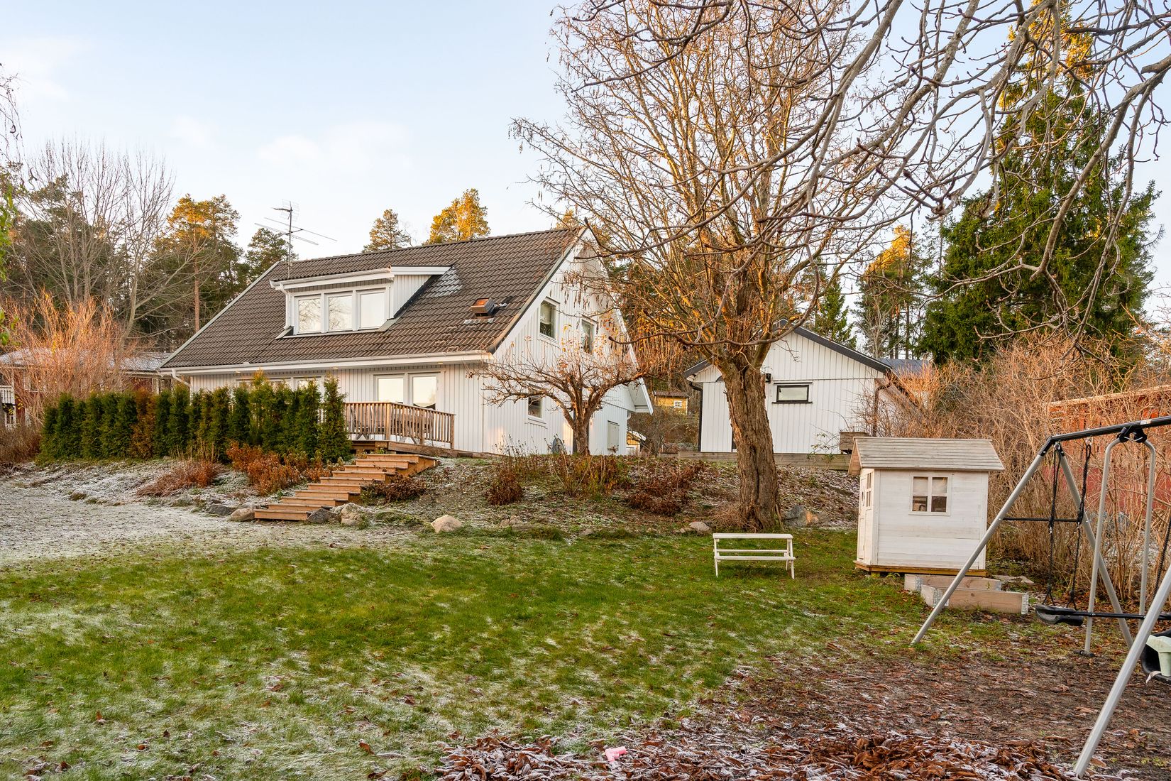 - Plan och lättskött tomt med plats för studsmatta, fotbollsmål samt en charmig lekstuga
